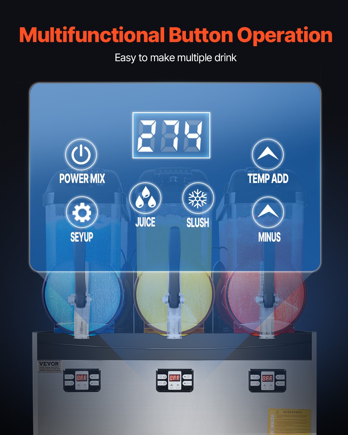 VEVOR Komercijalni stroj za slushie 12L x 3, stroj za smrznuta pića s tri spremnika, stroj za slushie od nehrđajućeg čelika od 144 šalice s tipkovnicom, uređaj za posluživanje mekih pića za zabave, restorane, kafiće i barove