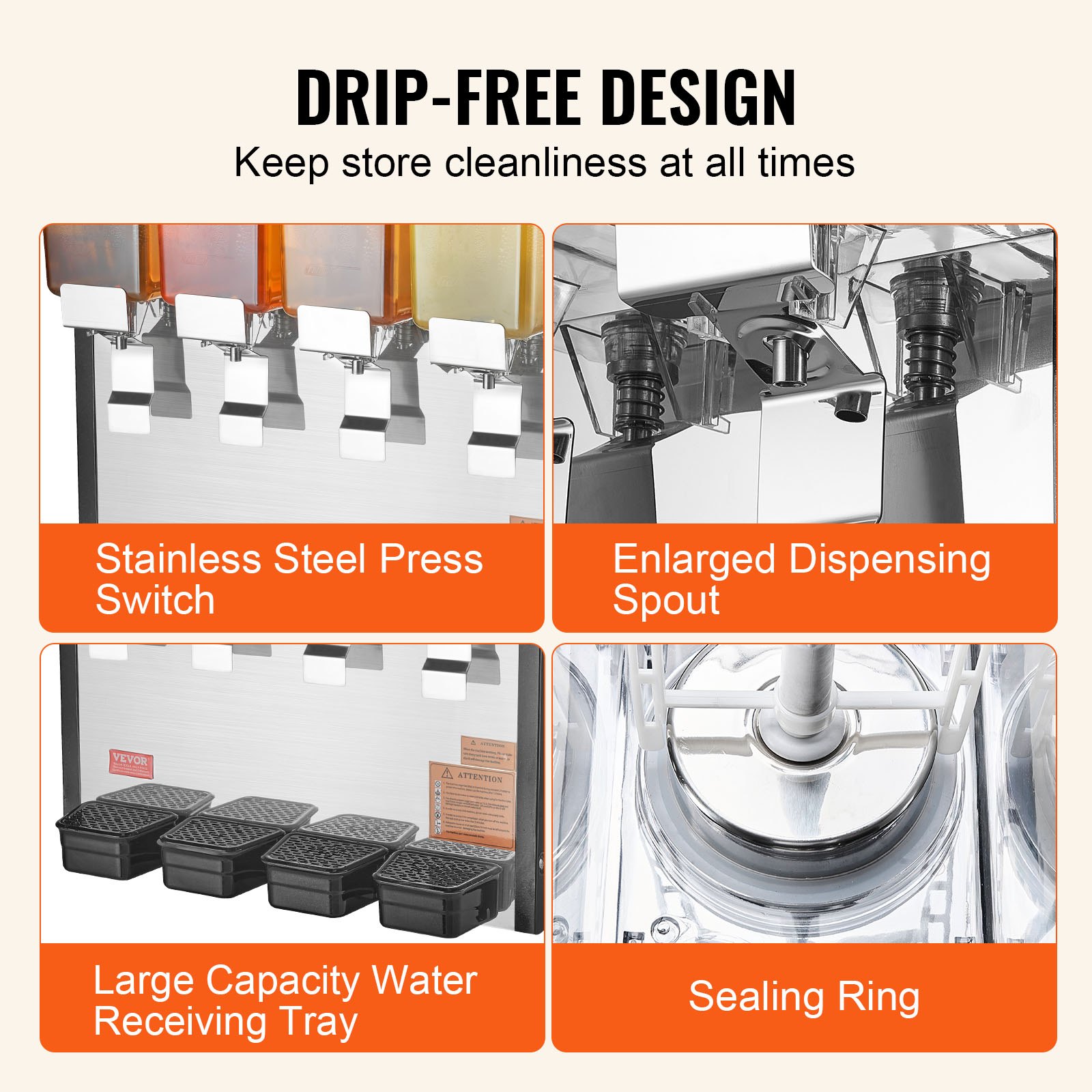 VEVOR komercijalni dozator pića s 4 spremnika, dozator soka od 10 l (po spremniku), dozator ledenog čaja od nehrđajućeg čelika od 430 W s temperaturom hlađenja 7-12 °C, za hladna pića, restoran, bar, zabave, švedski stol, catering