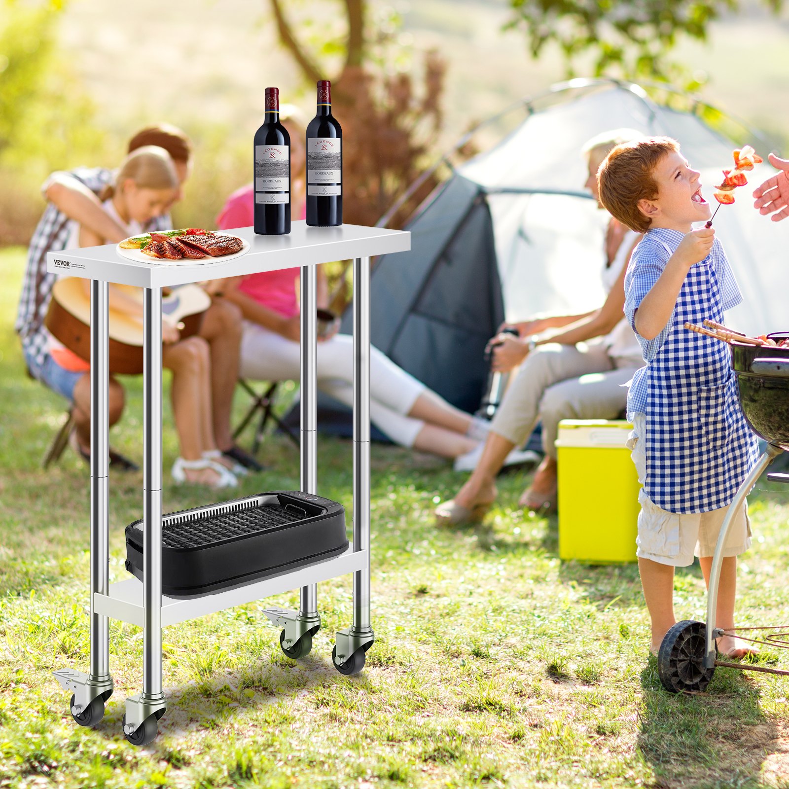 VEVOR Komercijalni stol za pripremu hrane od nehrđajućeg čelika, s 4 kotača, 3 podesiva visina, 762 x 305 x 954,6 mm, Radni stol za pripremu hrane za komercijalne restorane