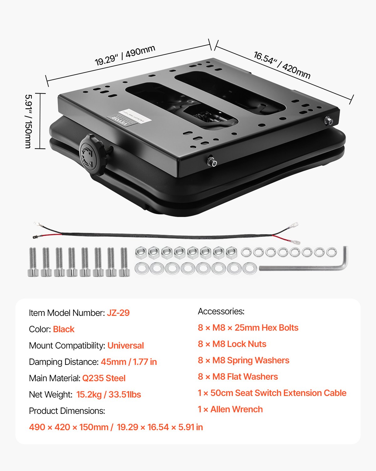 VEVOR komplet ovjesa sjedala 490x420x150 mm bez klizne šine sjedala, univerzalni zračni ovjes za kosilice s nultom točkom okretanja, s poklopcem za prašinu, komplet ovjesa traktorskog sjedala za viličare, buldožere