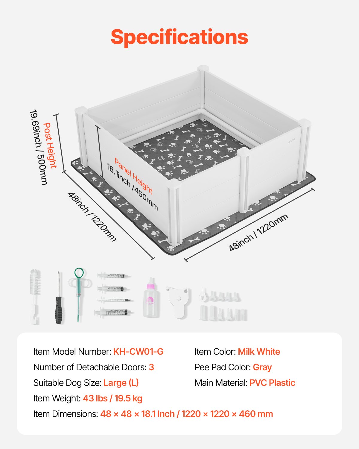 Prikladna veličina za psa: Velika (L), Dimenzije artikla: 48 x 48 x 18,1 inča / 1220 x 1220 x 460 mm, Boja podloge za mokrenje: Siva, Glavni materijal: PVC plastika, Broj modela artikla: KH-CW01-G, Boja artikla: Mliječno bijela, Broj uklonjivih vrata: 3, Težina artikla: 43 lbs / 19,5 kg