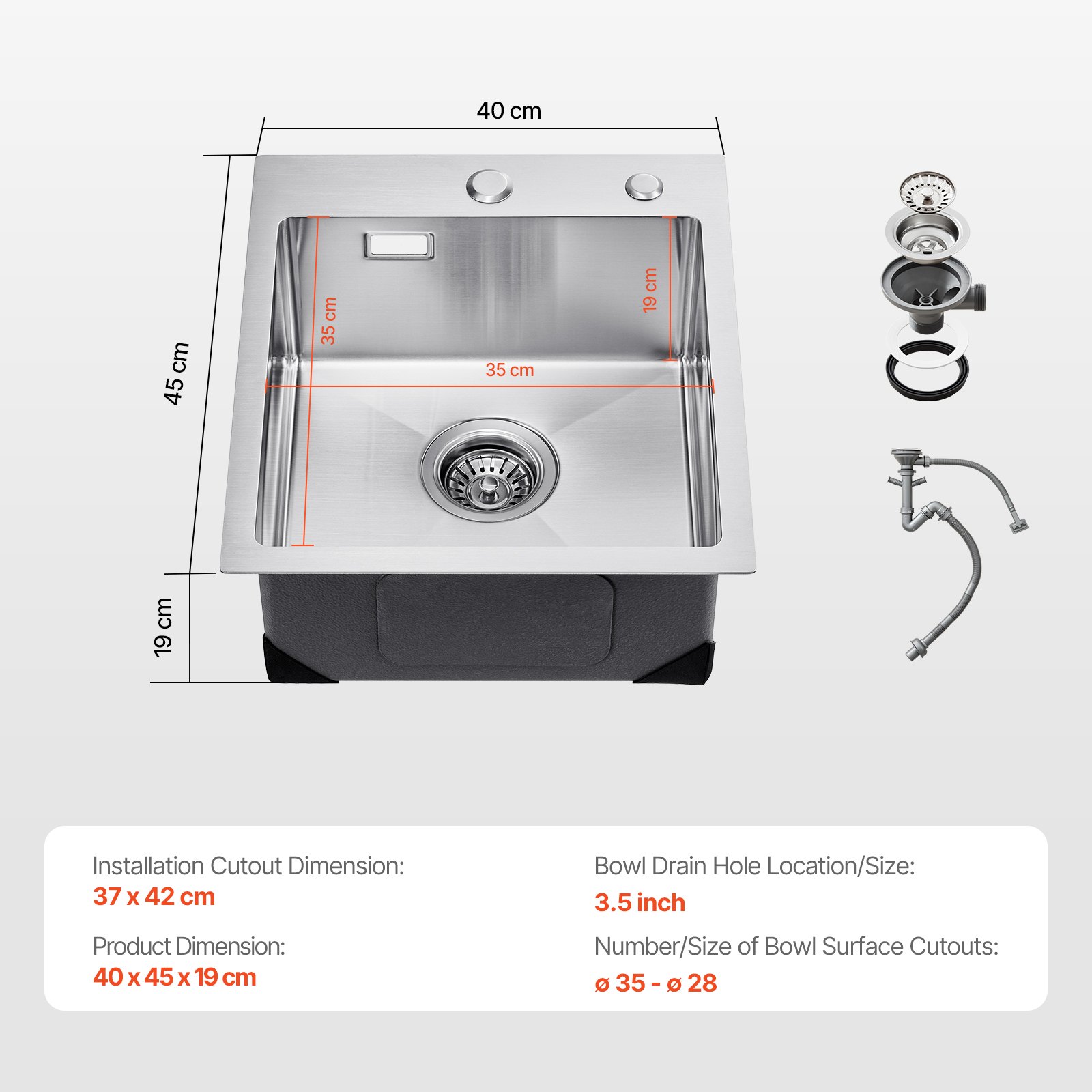 VEVOR Kuhinjski sudoper, Ugradbeni sudoper, 40 x 45 x 19 cm, Nehrđajući čelik, Sudoper za montažu na gornju ploču, Jedna posuda s priborom, Kućanski sudoper za kamp-kućicu, Pripremnu kuhinju, Bar