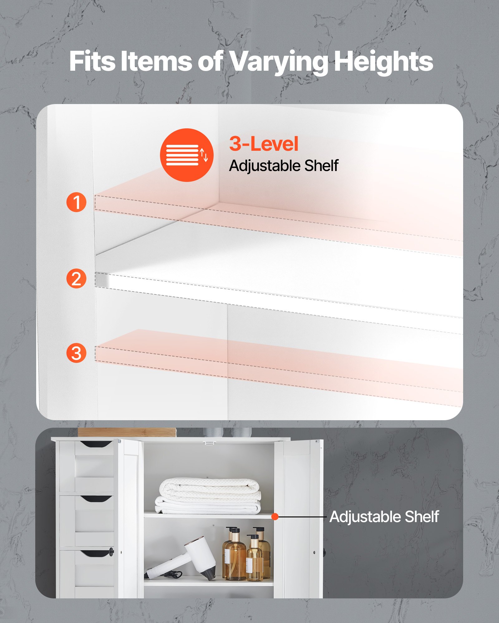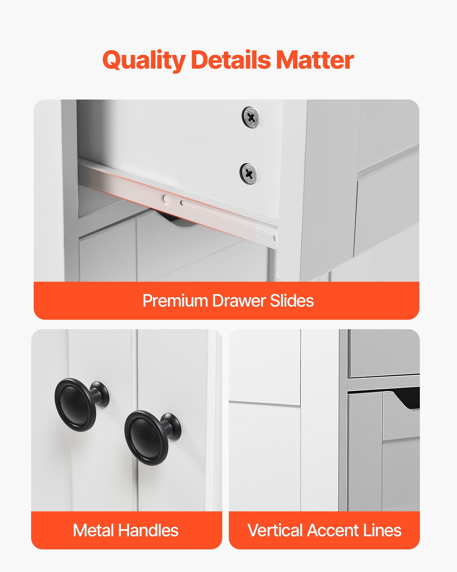 VEVOR kupaonski ormarić, drveni ormarić s 3 razine, 2 vrata, 4 ladice i podesiva polica, podni ormarić za kuhinju/dnevni boravak/ulaz, bijeli