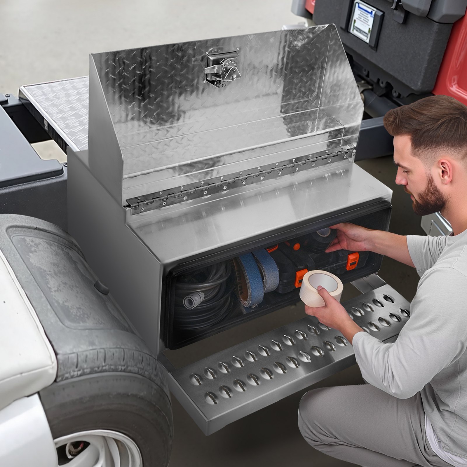 VEVOR kutija za stepenice, 760x750x400 mm, aluminijska kutija za alat, kutija za pohranu za stepenice za vozačevu kabinu s T-ručkom, brava i ključevi za kamione s ravnom platformom, dizalice i poluprikolice