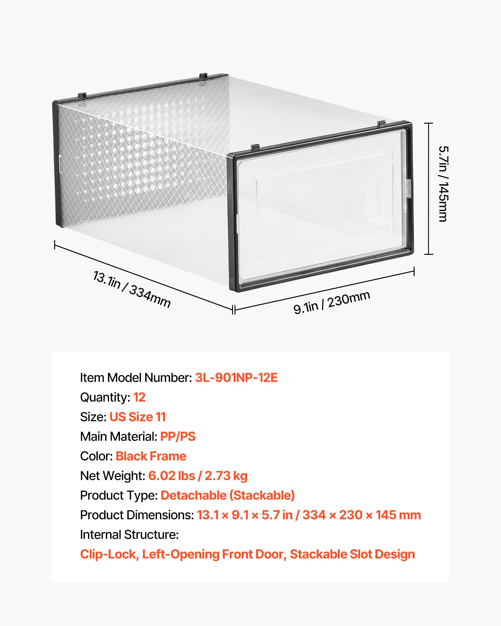 Vrsta proizvoda: Uklonjivo (slagati), Količina: 12, Neto težina: 6,02 lbs / 2,73 kg, Glavni materijal: PP / PS, Boja: Crni okvir, Veličina: Američka veličina 11, Broj modela artikla: 3L-901NP-12E, Dimenzije proizvoda: 13,1 x 9,1 x 5,7 in / 334 x 230 x 145 mm