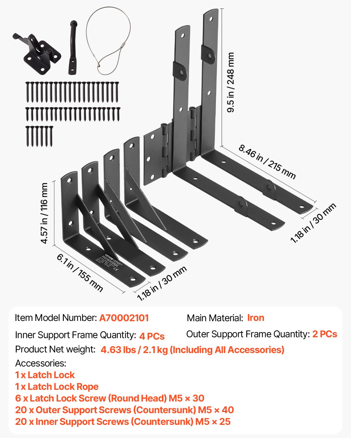Glavni materijal: Željezo, Veličina unutarnjeg potpornog okvira: 6,1 x 4,57 x 1,18 in / 155 x 116 x 30 mm, Količina unutarnjeg potpornog okvira: 4 kom, Količina vanjskog potpornog okvira: 2 kom, Broj modela artikla: A70002101, Veličina vanjskog potpornog okvira: 9,5 x 8,46 x 1,18 in / 248 x 215 x 30 mm, Neto težina proizvoda: 4,63 lbs / 2,1 kg (uključujući sav pribor)