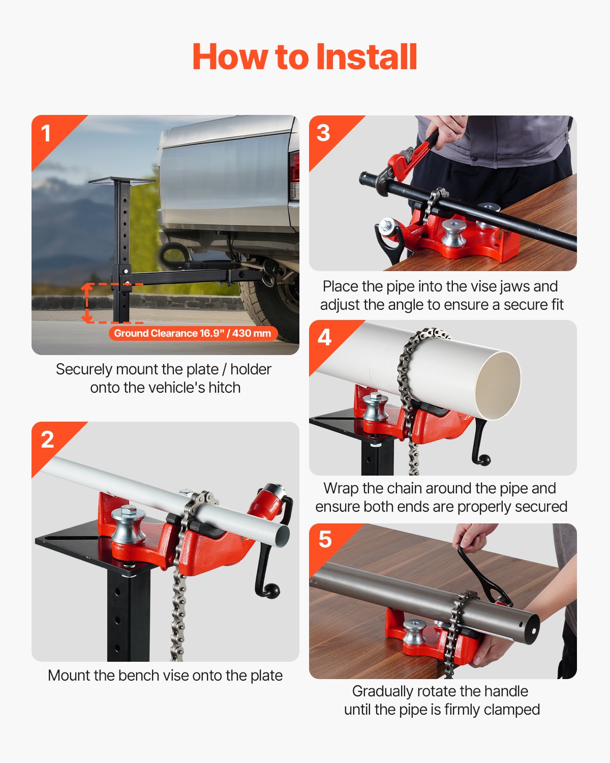 VEVOR škripac za lančanu cijev, kapacitet cijevi 3,175-125 mm, 660 mm lanac i baza od lijevanog željeza, držač ploče škripca za kuku za prikolicu s podesivom visinom – odgovara prijemnicima 50 x 50 mm