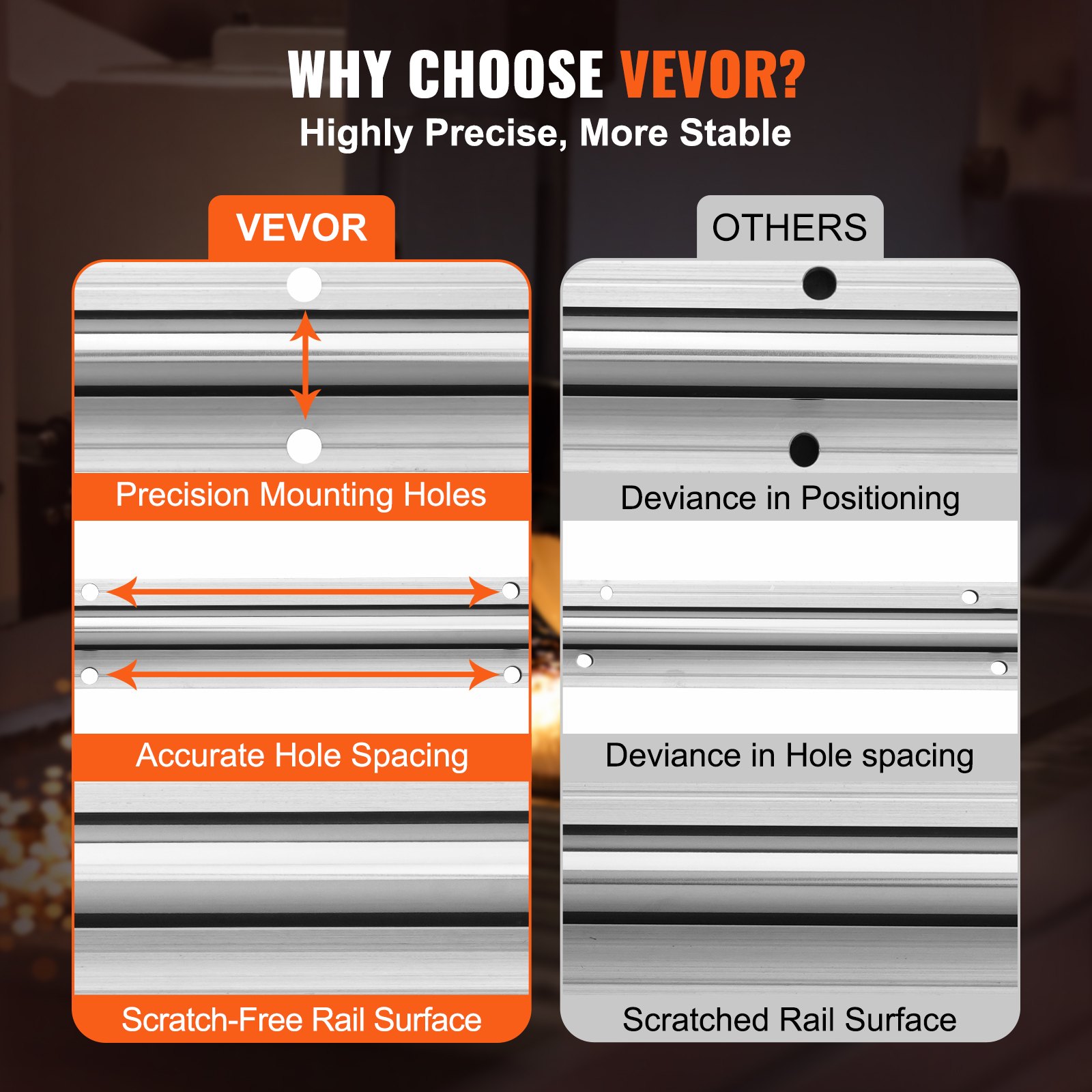 VEVOR Linearna vodilica, 2 kom. SBR20-1800 mm Vodilica od ugljičnog čelika i aluminija s 4 kom. SBR20UU kliznih blokova, linearni ležajevi, CNC dijelovi za 3D Pisači, Glodalice/Tokari. Lako podnošenje pritiska. Glatko klizanje bez zastoja. Preciznije nego ikad prije. Širok raspon primjena. Snažna otpornost na koroziju. Jednostavna ugradnja. Promjer osovine: Φ 20 mm, Statičko opterećenje (po bloku): 1370 N, Razmak montažnih rupa A: 35 mm (1,4 in), Veličina kliznog bloka (D x Š x V): 50 x 48 x 39 mm (2 x 1,9 x 1,5 in), Razmak montažnih rupa B: 35 mm (1,4 in), Neto težina: 13,4 kg (29,5 lbs), Veličina pakiranja (D x Š x V): 1930 x 145 x 80 mm (76 x 5,7 x 3,1 in), Materijal: Ugljični čelik i aluminij, Duljina vodilice: 1800 mm (70,9 in), Model kliznog bloka: SBR20UU, Broj modela artikla: SBR20-C 1800L, Dimenzije proizvoda (D x Š x V): 1800 x 45 x 36,3 mm (70,9 x 1,75 x 1,4 in), Dinamičko opterećenje (po bloku): 882 N