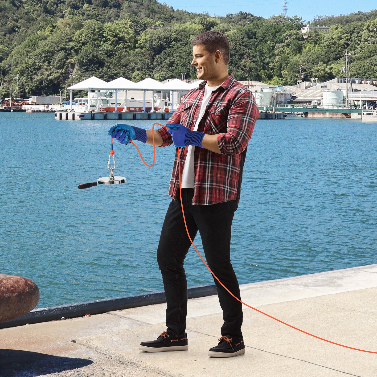 VEVOR Magnetski ribolovni komplet (narančasti) 907 kg jednostrana vučna sila, ribolovni set s neodimijskim magnetom od rijetkih zemalja uklj. kuku za hvatanje, uže za teške uvjete rada, rukavice (plave), torbicu za nošenje, vijak za ušicu, ljepilo. Profesionalni ribolovni set. Potpuna zaštita od hrđe. Opsežan pribor. Prenosivost. Svestrana funkcionalnost. Izdržljivo i pouzdano uže