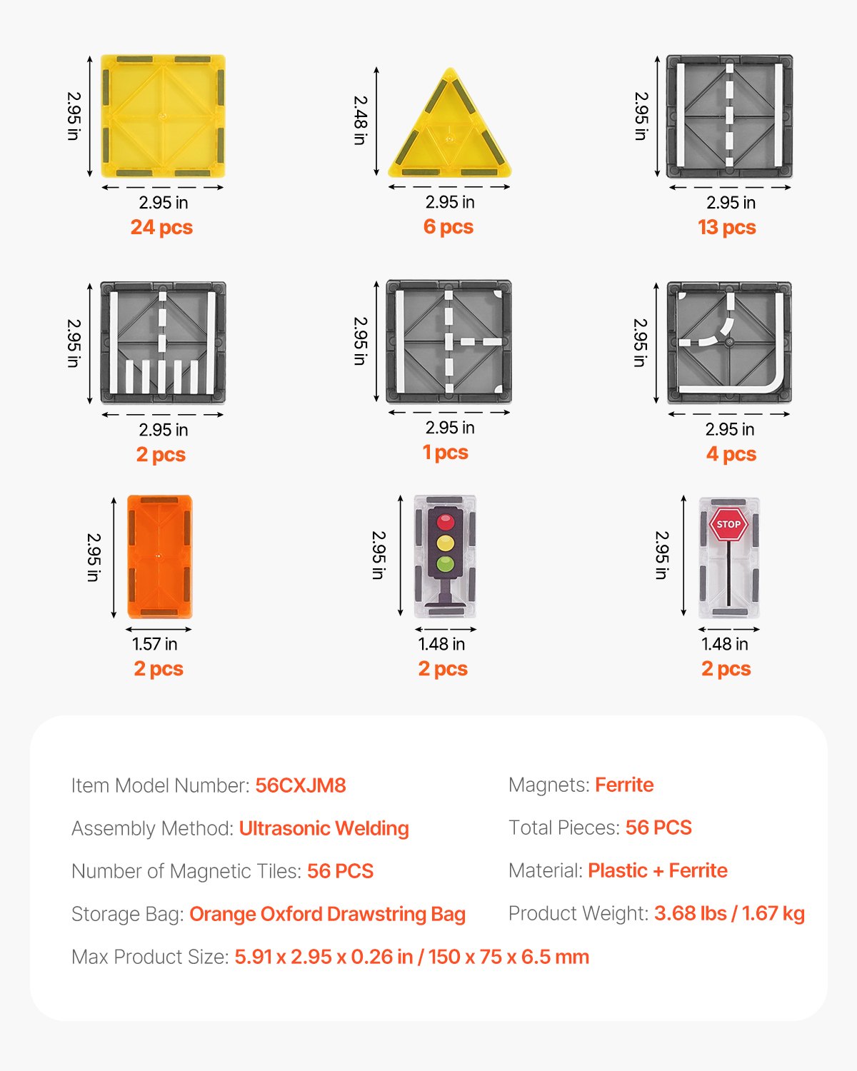 Broj magnetskih pločica: 56, Maksimalna veličina proizvoda: 5,91 x 2,95 x 0,26 in / 150 x 75 x 6,5 mm, Težina proizvoda: 3,68 lbs / 1,67 kg, Materijal: Plastika + ferit, Broj modela artikla: 56CXJM8, Vrećica za pohranu: Narančasta Oxford vrećica s vezicom, Način sastavljanja: Ultrazvučno zavarivanje, Magneti: Ferit, Ukupna količina: 56