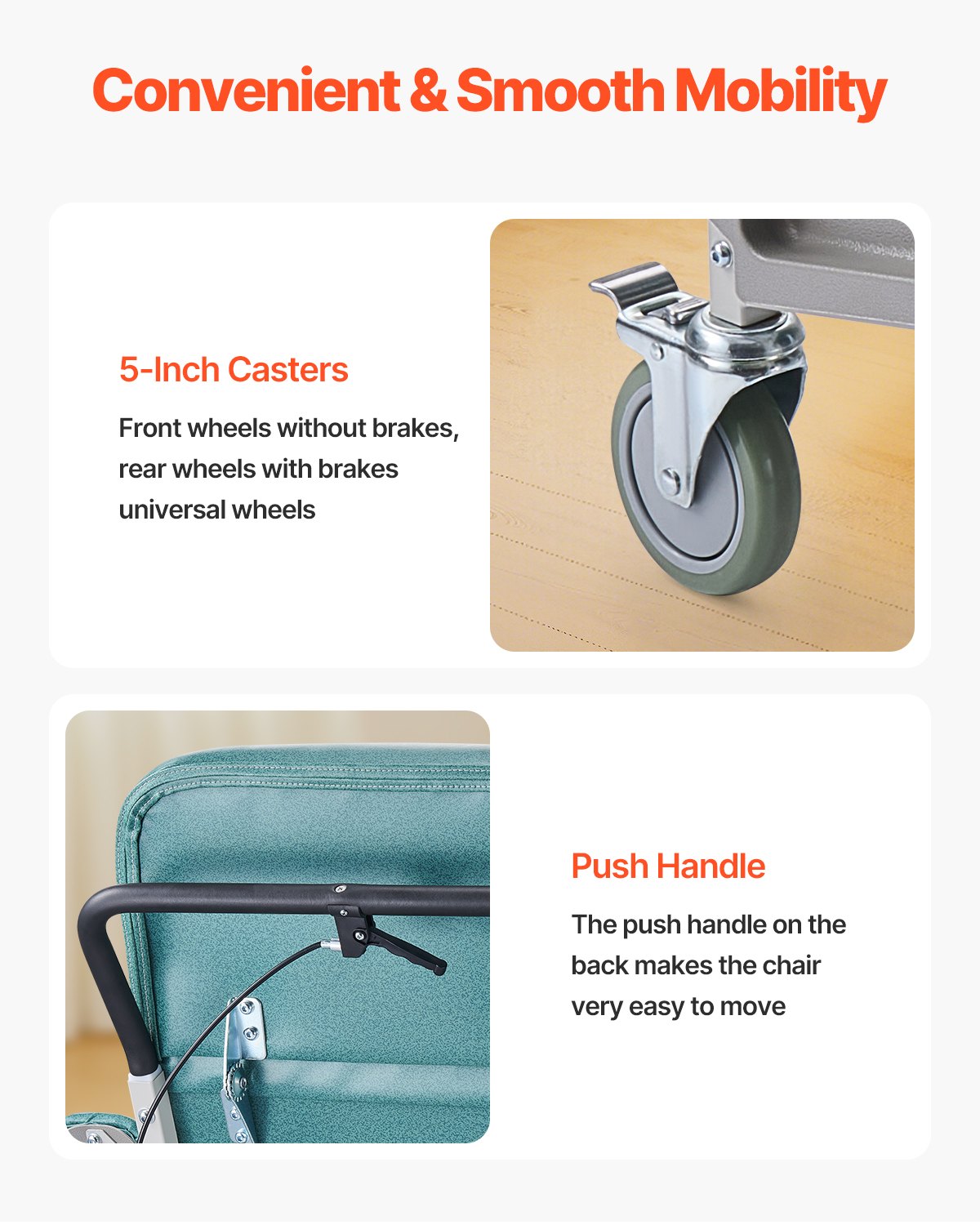 VEVOR Medicinska naslonjača, gerijatrijska stolica s 4 položaja, stolica za pacijente s 4 kotačića, mekano podstavljeno sjedalo i 2 poslužavnika za bolnicu, starački dom, gerijatrijsku kućnu njegu