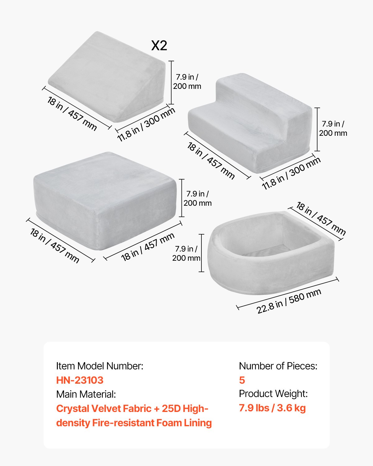 Težina proizvoda: 7,9 lbs / 3,6 kg, Glavni materijal: Kristalna baršunasta tkanina + 25D podstava od visokogustoćne vatrootporne pjene, Broj modela artikla: HN-23103, Količina: 5