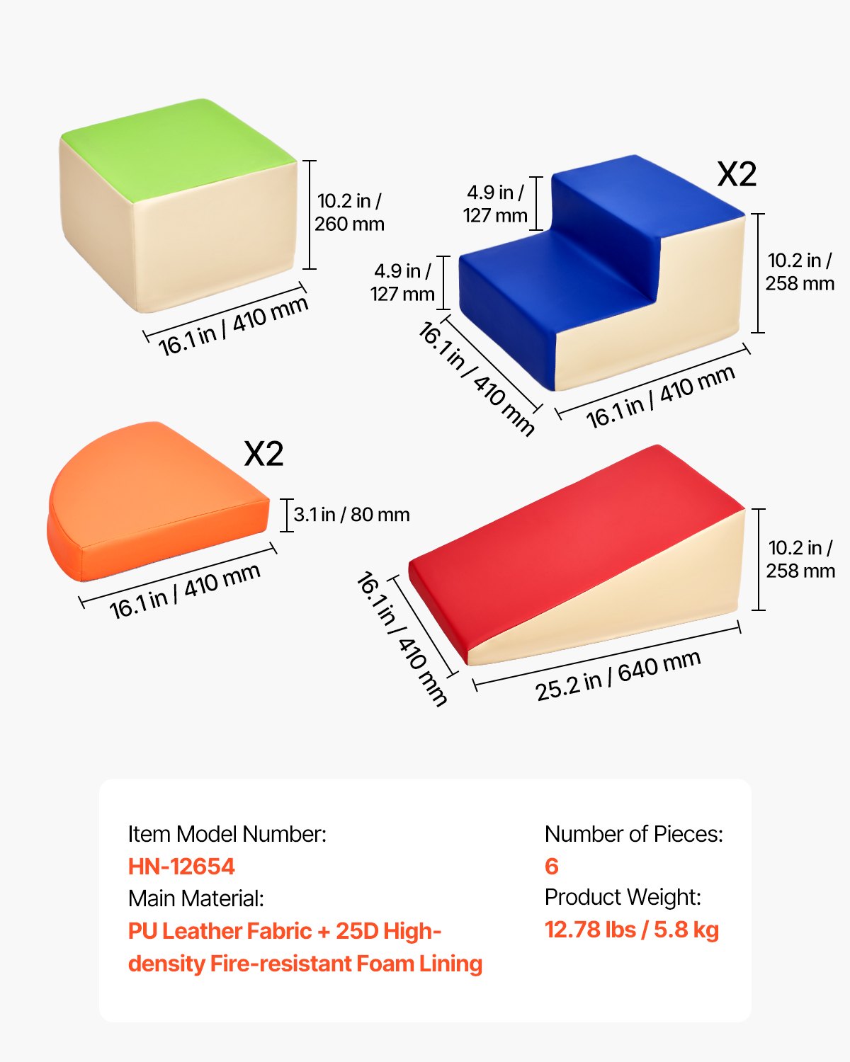 VEVOR Mekani građevinski blokovi, set od 6 dijelova, pjenasti građevinski blokovi za malu djecu od 6 mjeseci do 3 godine, divovski građevinski blokovi od PU kože, set za igru penjanja i puzanja u zatvorenom prostoru za puzanje i klizanje