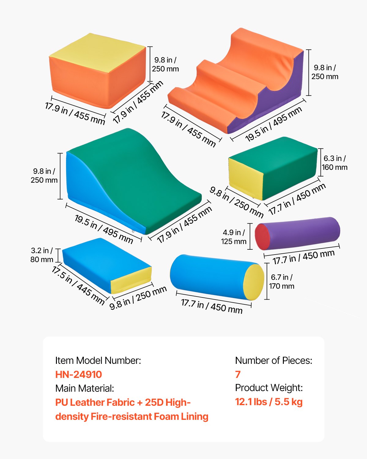 VEVOR Mekani građevinski blokovi, set od 7 dijelova, pjenasti građevinski blokovi za malu djecu od 6 mjeseci do 3 godine, divovski građevinski blokovi od PU kože, set za igru penjanja i puzanja u zatvorenom prostoru za puzanje i klizanje