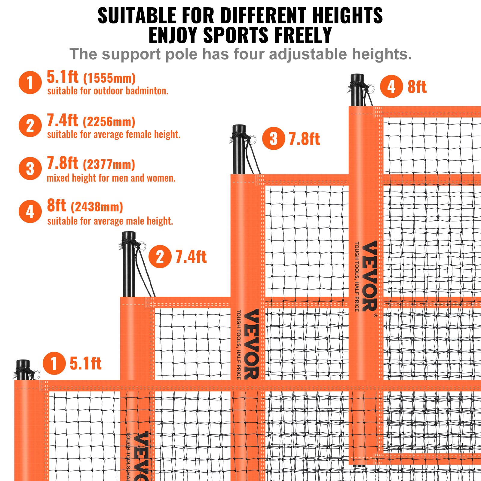 VEVOR mreža za odbojku s podesivom visinom, prijenosna mreža za odbojku na pijesku 91,44 x 970 cm, narančasta mreža za odbojku, sklopiva mreža za odbojku s torbom za odbojku i nošenje i reketom za badminton
