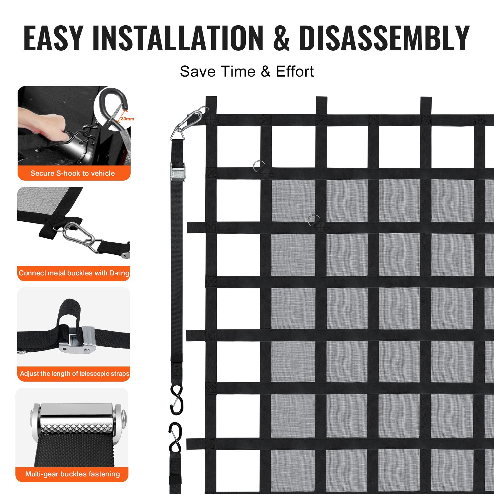 VEVOR mreža za teret, 183 x 145 cm, mreža za tovarni prostor kamiona, 4 podesiva remena s karabinerima i S-kukama, transportna mreža otporna na habanje i vremenske uvjete, mreža za prtljagu prikladna za pickup, kamion, Jeep, SUV, brod