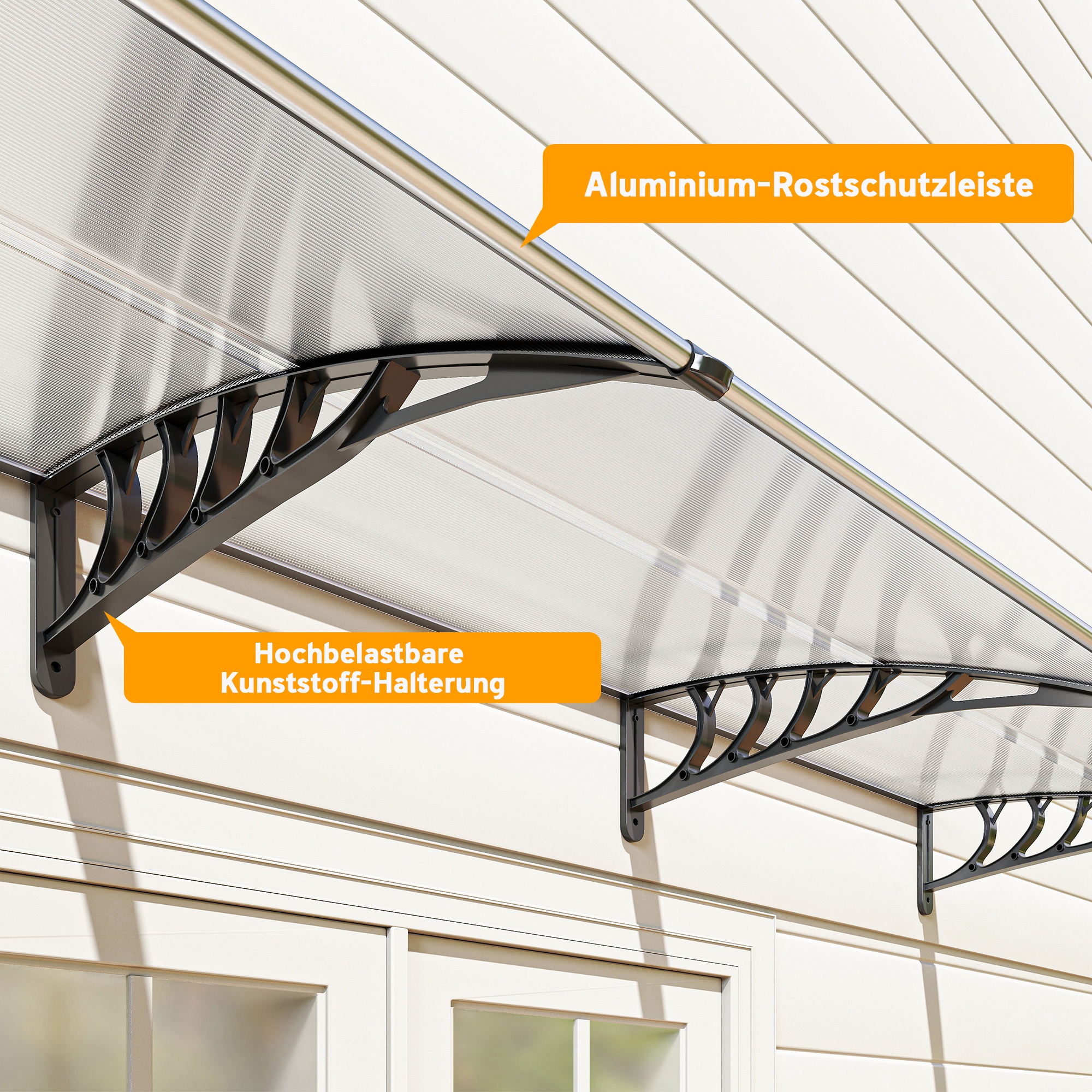Zakrivljeni dizajn nudi vam bolju zaštitu. Tenda ima dva kruta plastična nosača na krajevima za spajanje na zid, dok lagani aluminijski stupovi spajaju krajeve s polikarbonatnim pločama, bez napora štiteći vas od vremenskih uvjeta. S UV premazom na vrhu koji štiti od štetnih UV zraka, a također pomaže u sprječavanju pregrijavanja vaše kuće kada sunce sja. Opis: ✔ Čvrsti plastični okvir s aluminijskim stupovima koji spajaju dva kraja osigurava stabilnu i izdržljivu tendu. ✔ Zakrivljena glavna ploča od polikarbonata otporna je na kišu i snijeg te se može lako postaviti ispred vrata i prozora. ✔ Dvostruka konstrukcija za dvostruku zaštitu. ✔ UV zaštitna ploča na tendi štiti od UV zraka, jake sunčeve svjetlosti, kiše i snijega. ✔ Jednostavan dizajn, odgovara gotovo bilo gdje. ✔ Tendu mora montirati na čvrsti zid korisnik ili ju mora postaviti stručnjak. ✔ NAPOMENA: Ako je tenda prekrivena snijegom, mora se odmah očistiti, posebno u područjima s čestim snježnim padalinama. padanje snijega