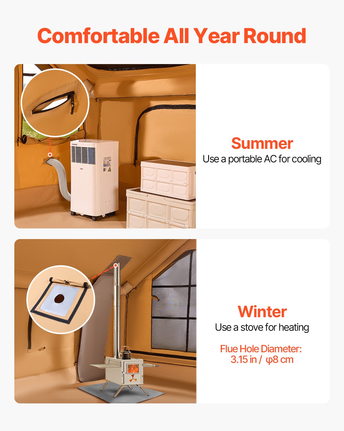 VEVOR Napuhani kamperski šator, šator za 5-8 osoba s ručnom pumpom, glamping šator 4x3x2,2 m s 2 krovna prozora, tendom, priključkom za štednjak, 2 vrata, mrežastim prozorima i torbom za pohranu