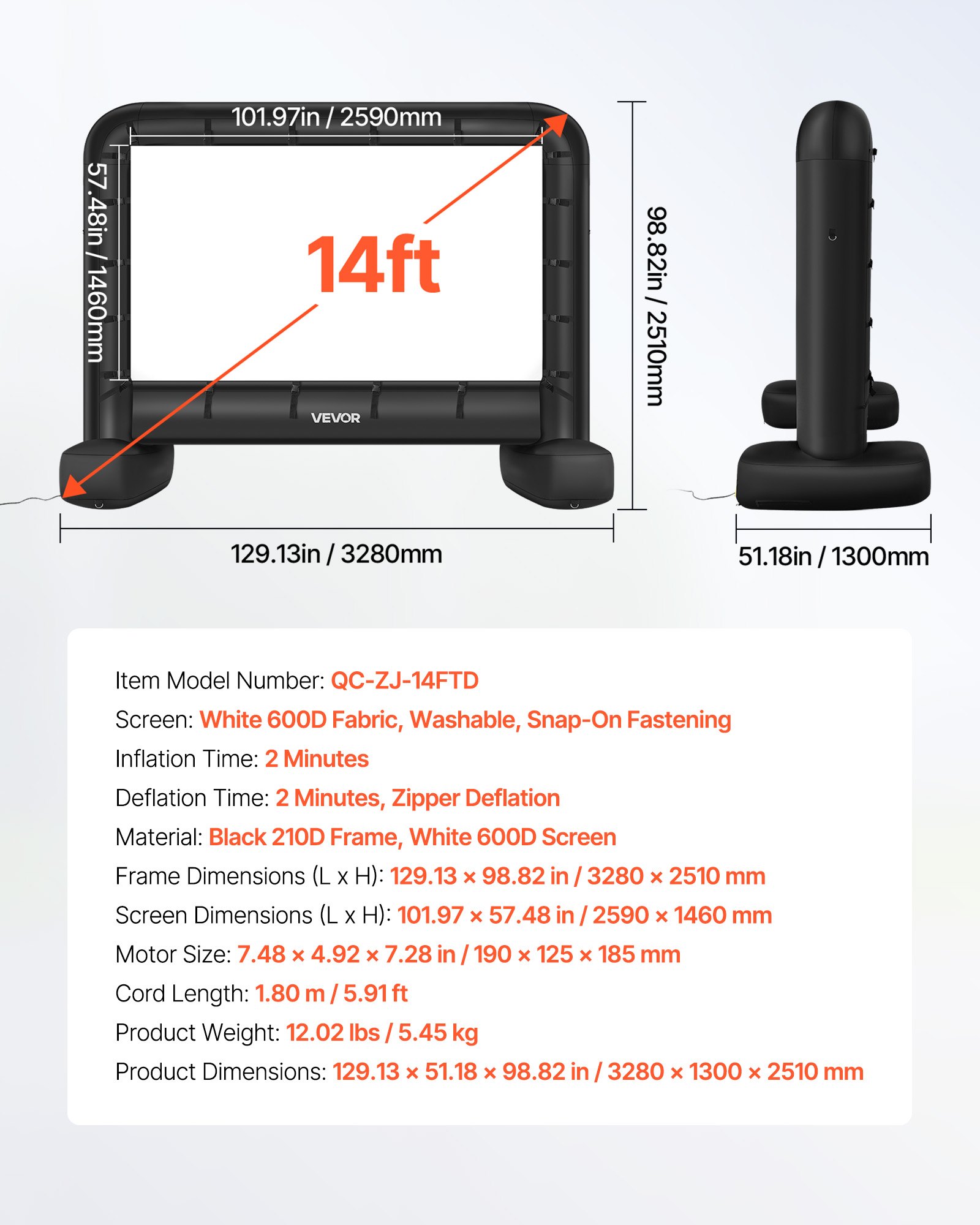 Zaštitna mrežica: Bijela tkanina 600D, periva, zatvarač na kopču, Dimenzije okvira (D x V): 129,13 x 98,82 in / 3280 x 2510 mm, Vrijeme napuhavanja: 2 minute, Duljina kabela: 1,80 m / 5,91 ft, Težina proizvoda: 12,02 lbs / 5,45 kg, Broj modela artikla: QC-ZJ-14FTD, Dimenzije mrežice (D x V): 101,97 x 57,48 in / 2590 x 1460 mm, Materijal: Crni okvir od 210D, bijela mrežica od 600D, Veličina motora: 7,48 x 4,92 x 7,28 in / 190 x 125 x 185 mm, Dimenzije proizvoda: 129,13 51,18 x 98,82 in / 3280 x 1300 x 2510 mm, vrijeme ispuhivanja: 2 minute, ispuhivanje putem patentnog zatvarača