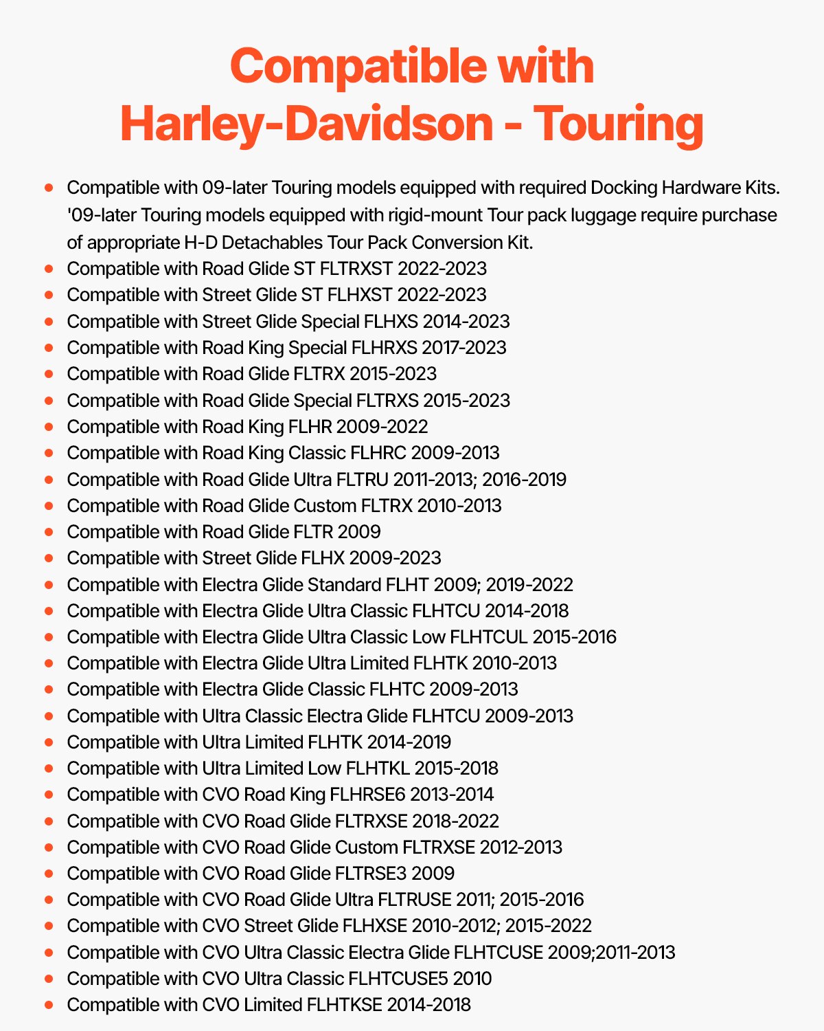 Okvir: 14 x 11 x 8 inča / 355 x 275 x 210 mm, Glavni okvir: 15 x 12,6 x 16 inča / 390 x 320 x 400 mm, Dimenzije ugradnje: Unutarnja širina: 12 inča / 305±10 mm, Kompatibilni model: Harley-Davidson Touring modeli 2009–2024, Broj modela artikla: 1504, Visina naslona: 16 inča / 400 mm, Težina proizvoda (uključujući svu dodatnu opremu): 5,7 kg