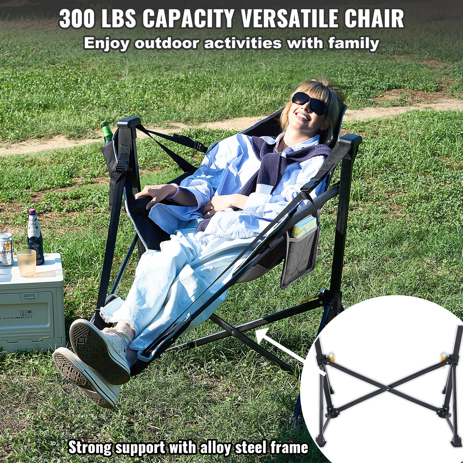 VEVOR Naslonjajuća kamperska stolica, nosivost 136 kg, sklopiva ljuljačka s osloncem za noge, torbom za pohranu, naslonom za glavu i podesivim naslonom, za kampiranje i druge aktivnosti na otvorenom