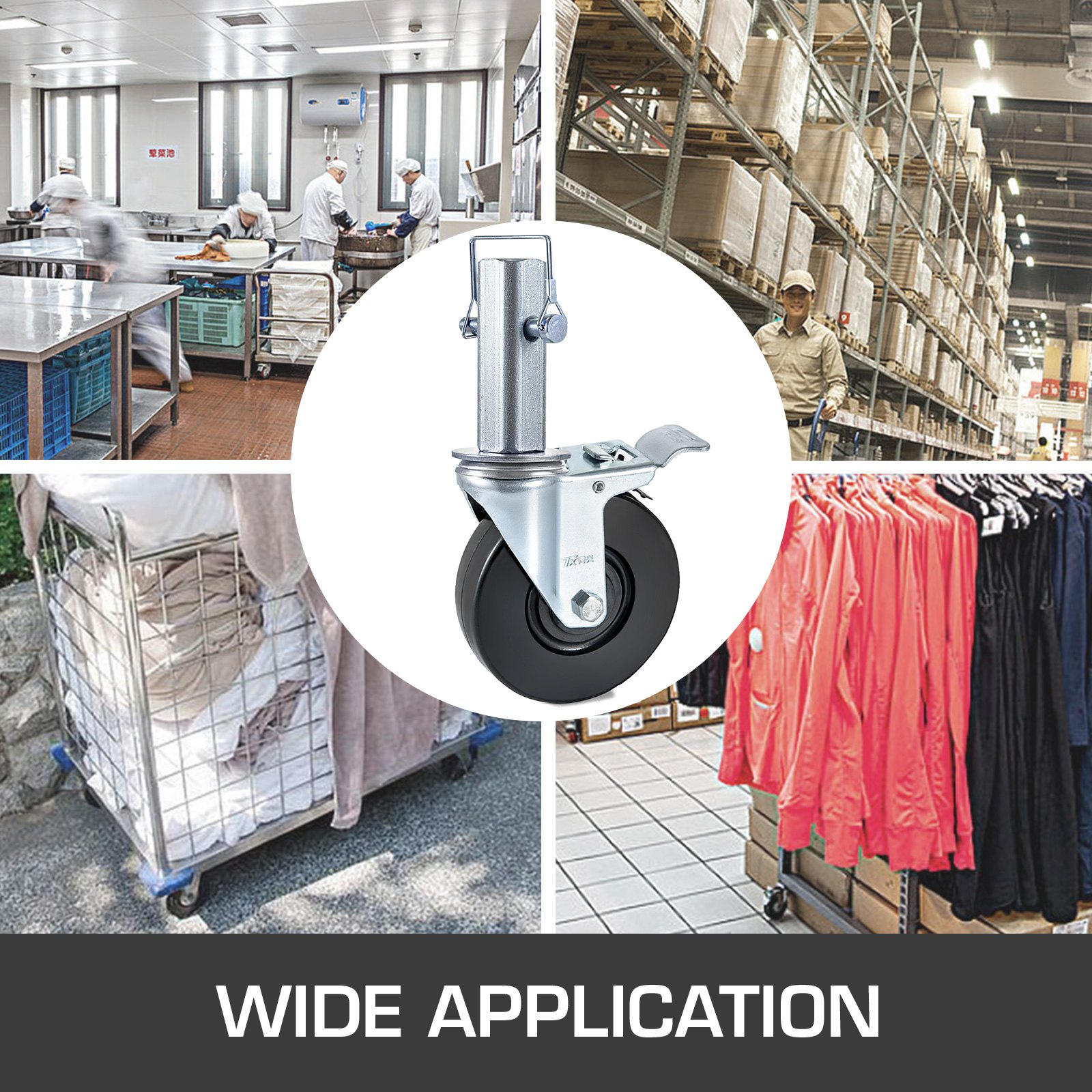 Promjer kotača: 5 inča / 12,7 cm, Vrsta kočnice: Dvostruka kočnica s blokiranjem, Veličina pakiranja: 13 x 9 x 7 inča, Šipke: 1,25 x 4 inča, Nosivost: 200 kg svaka, Materijal: Guma + Čelik, Bruto težina: 8,64 kg / 19 lb, Promjer provrta: 0,4 inča / 10 mm