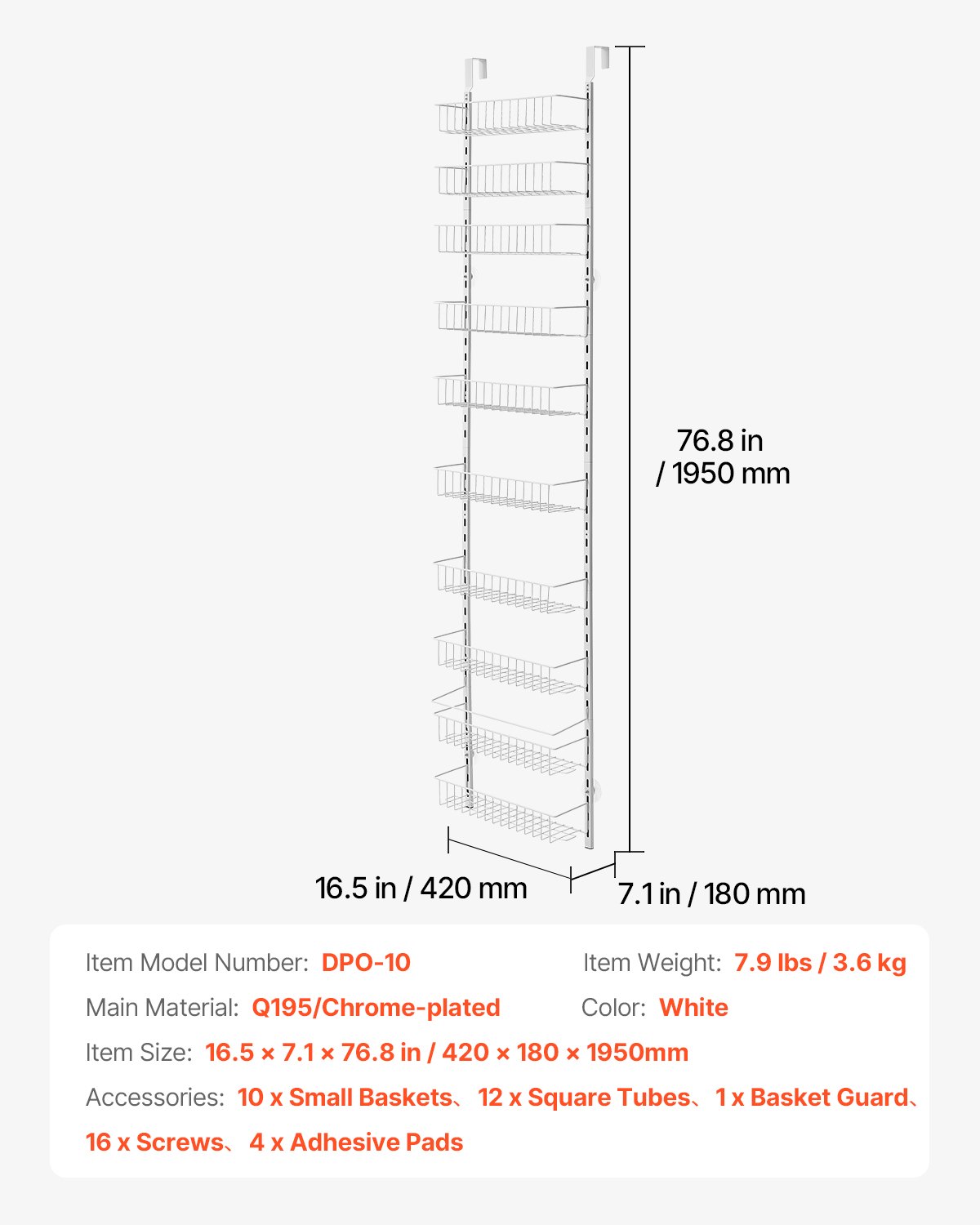 Glavni materijal: Q195/kromirano, Boja: bijela, Veličina artikla: 16,5 x 7,1 x 76,8 inča / 420 x 180 x 1950 mm, Broj modela artikla: DPO-10, Težina artikla: 7,9 lbs / 3,6 kg
