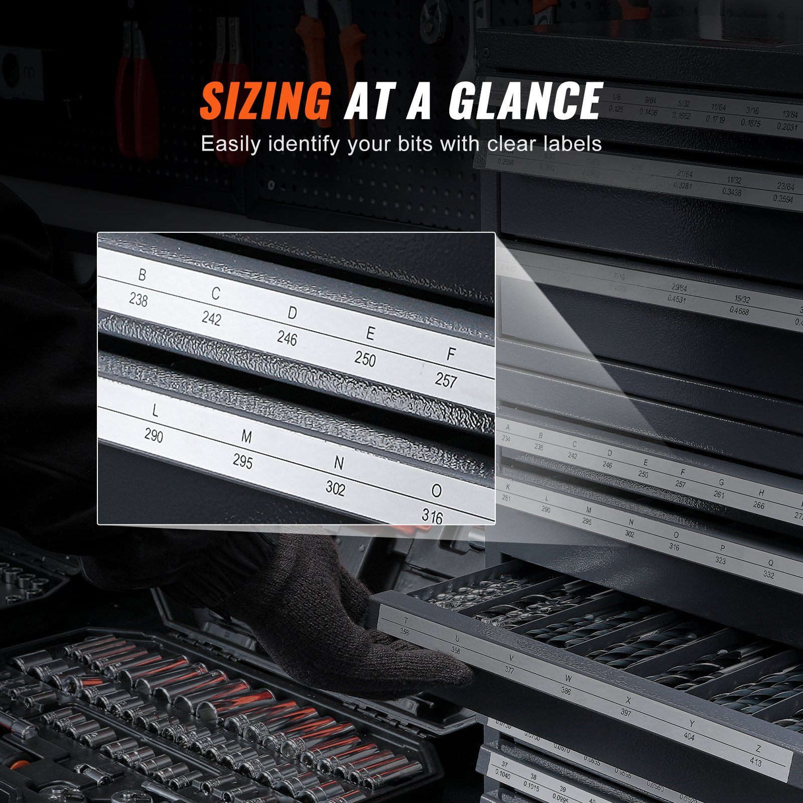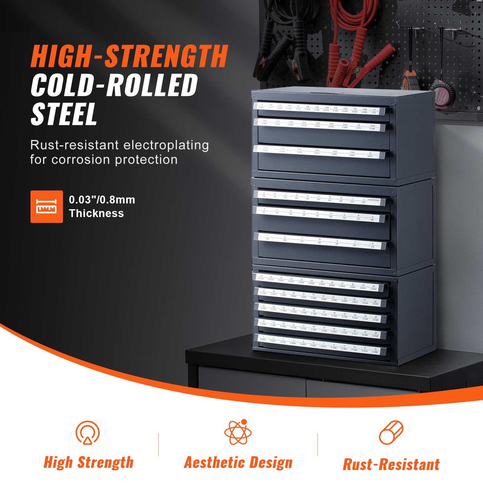 Debljina lima: 0,03 in / 0,8 mm,Površinska obrada: Praškasti premaz,Veličine kocki: 1/16-1/2 in, AZ, #1-#60,Boja: Siva s narančastom teksturom,Veličina proizvoda: 14,8 x 7,9 x 7,9 in / 375 x 200 x 200 mm,Neto težina (uključujući sav pribor): 50,3 lbs / 22,8 kg,Broj slojeva: 2 x 3 sloja, 1 x 5 slojeva,Materijal: Q235,Ukupan broj odjeljaka: 29 / 27 / 60,Broj modela artikla: ET3-ET5