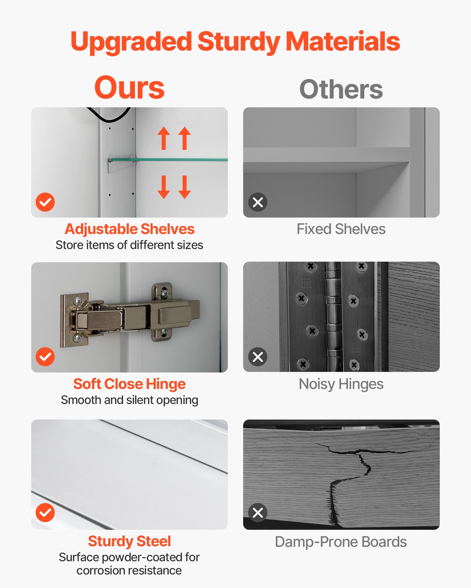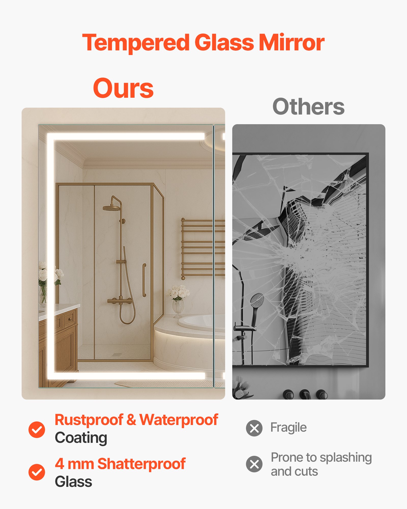 VEVOR Osvijetljeni ormarić za lijekove s ogledalom (60 x 80 cm) Zidni, kupaonski ormarić s 3 boje i prigušivom LED rasvjetom, HD ogledalom, funkcijom memorije/podesivim policama, prostorom za pohranu/utičnicama i USB priključcima