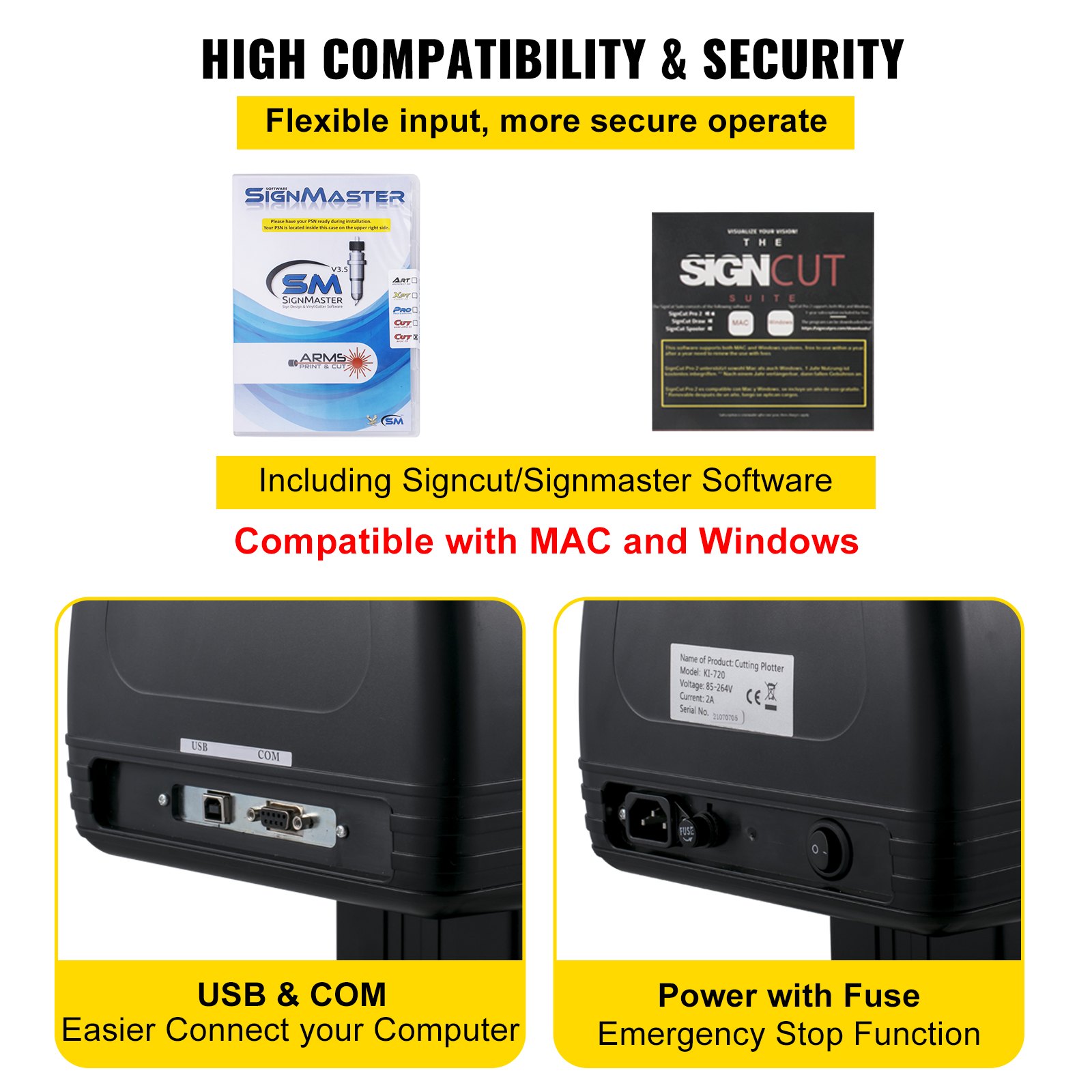 Veličina proizvoda: 60,6 x 20,1 x 39,4 inča / 154 x 51 x 100 cm, Vrsta motora: Koračni motor, Maks. širina rezanja: 49,6 inča / 1260 mm, Kompatibilnost operativnog sustava: MAC i Windows, Materijal: Aluminijska legura, Težina: 55,1 lbs / 25 kg, Maks. Brzina rezanja: 31,5 ips / 800 mm/s, Model: KI-1350A, Online način rada: USB / COM, Preciznost rezanja: ±0,004 in / ±0,01 mm, Maks. širina pomicanja: 53,2 in / 1350 mm, Maks. sila rezanja: 1,1 lbs / 500 g, Maks. debljina rezanja: 0,12 in / 3 mm, Napajanje: AC 90-264 V, Uključeni softver: Signcut & Signmaster