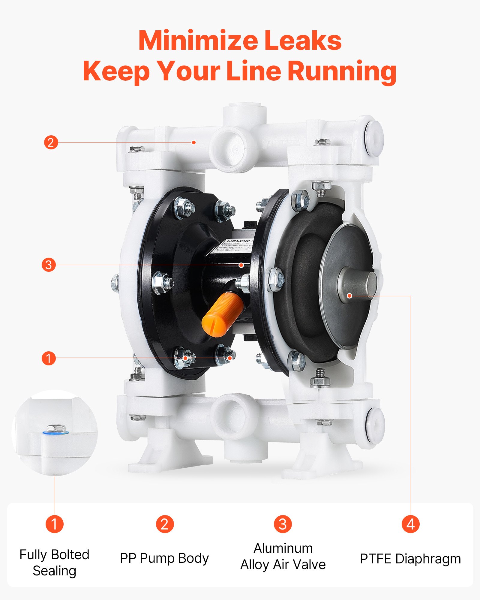 VEVOR Pneumatska pumpa s dvostrukom membranom, 17 L/min, ulaz i izlaz 38,1 mm, pneumatska pumpa za prijenos otpadnog ulja, maks. 100 PSI, kućište od polipropilena, zračni pogon za dizel, mast, kerozin, benzin