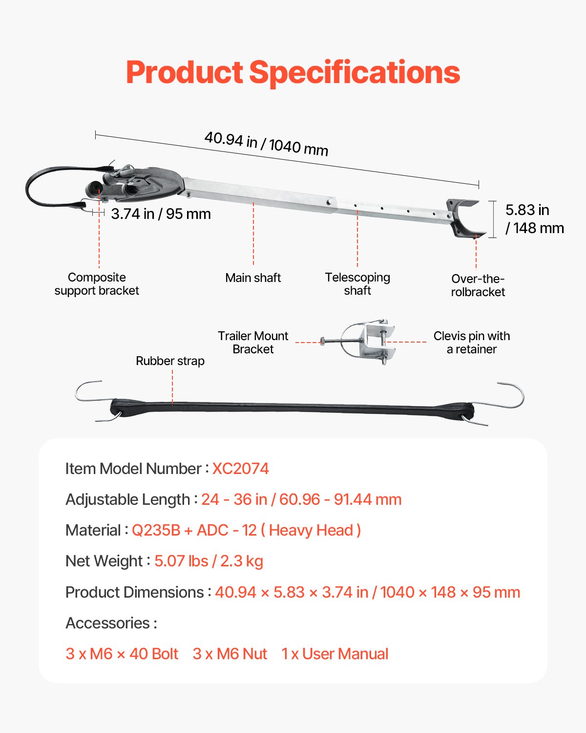 Podesiva duljina: 24-36 inča / 60,96-91,44 mm, Neto težina: 5,07 lbs / 2,3 kg, Materijal: Q235B+ADC-12 (teška glava), Dimenzije proizvoda: 40,94 x 5,83 x 3,74 inča / 1040 x 148 x 95 mm, Broj modela artikla: XC2029