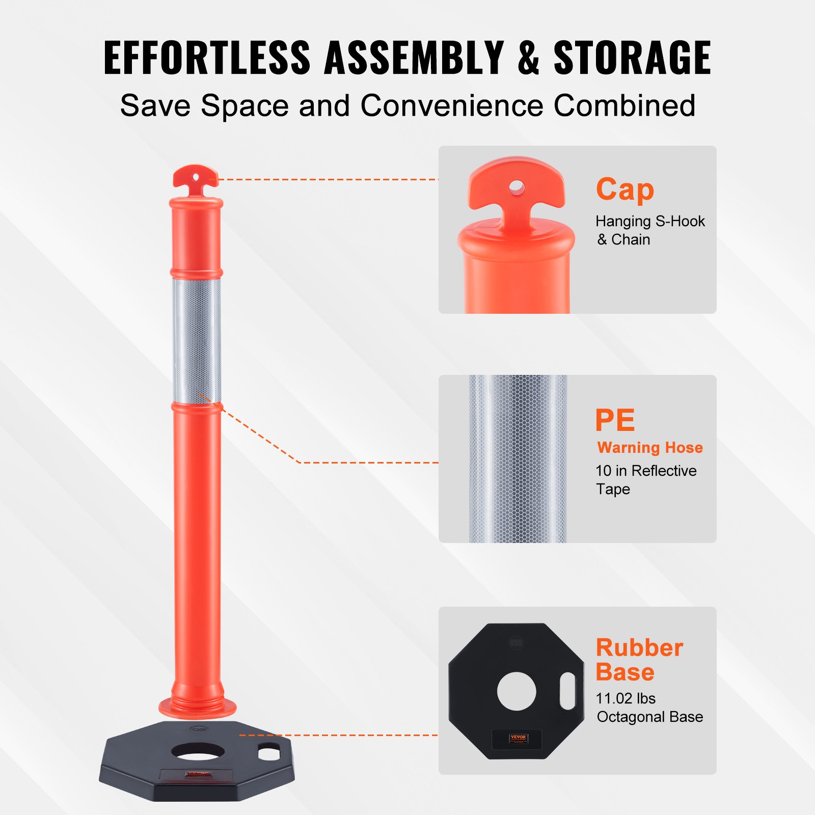 Težina baze: 11,02 lbs / 5 kg, Ukupan broj proizvoda: 2, Glavni materijali: PE & Guma, Dimenzije proizvoda: 16,93 x 16,93 x 43,31 inča / 430 x 430 x 1100 mm, Broj modela artikla: CC-F01-PB-2PCS, Težina po komadu: 12,79 lbs / 5,8 kg, Veličina reflektirajuće trake: 24,5 cm, Dimenzije baze: 16,93 x 16,93 inča / 430 x 430 mm
