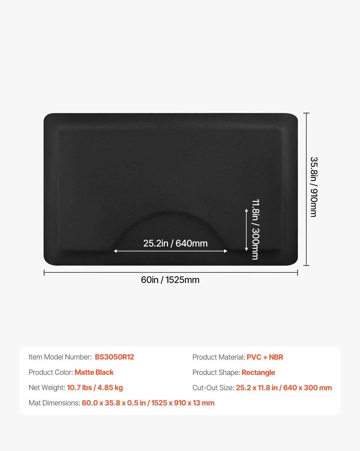 Boja proizvoda: Mat crna, Neto težina: 10,7 lbs / 4,85 kg, Veličina izreza: 25,2 x 11,8 in / 640 x 300 mm, Dimenzije prostirke: 60,0 x 35,8 x 0,5 in / 1525 x 910 x 13 mm, Broj modela artikla: BS3050R12, Materijal: PVC + NBR, Oblik proizvoda: Pravokutnik
