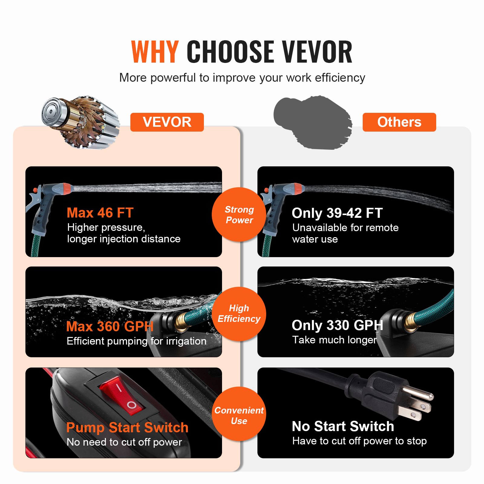 Pumpa za transfer vode opremljena je snažnim motorom od 1/10 KS, koji osigurava visok protok od 360 GPH i visinu isporuke od 46 stopa. Nijedan problem s transferom vode neće predstavljati izazov.