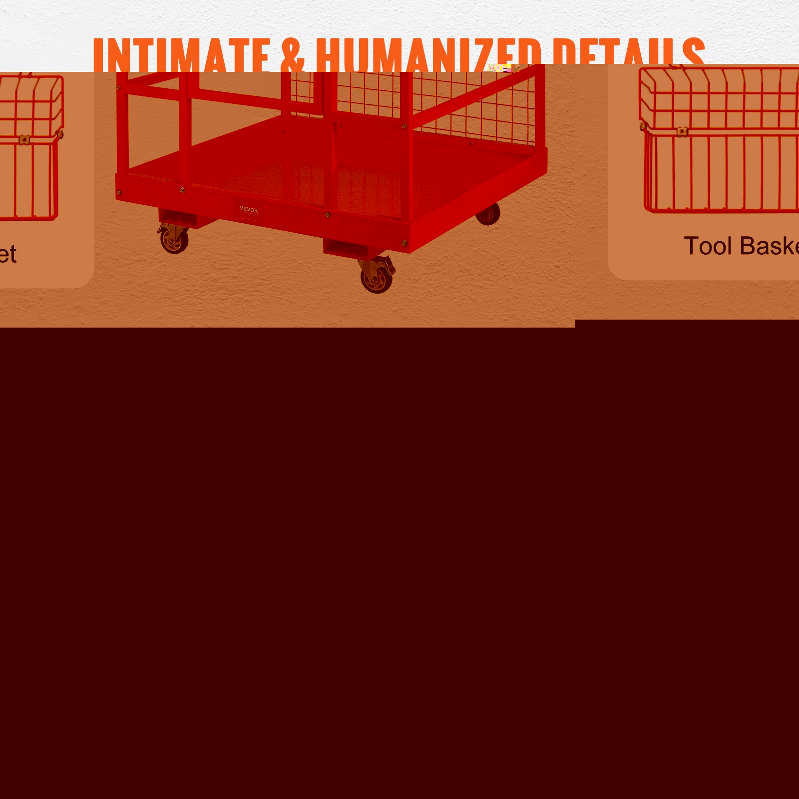 Boja: Narančasta, Maks. nosivost: 635 kg (1400 lbs), Težina proizvoda: 59 kg (130,1 lbs), Materijal: Čelik, Dimenzije proizvoda: 114,3 x 109,2 x 203,2 cm (45 x 43 x 80 inča), Veličina otvora za viličar: 16 x 6,5 cm (6,3 x 2,56 inča)