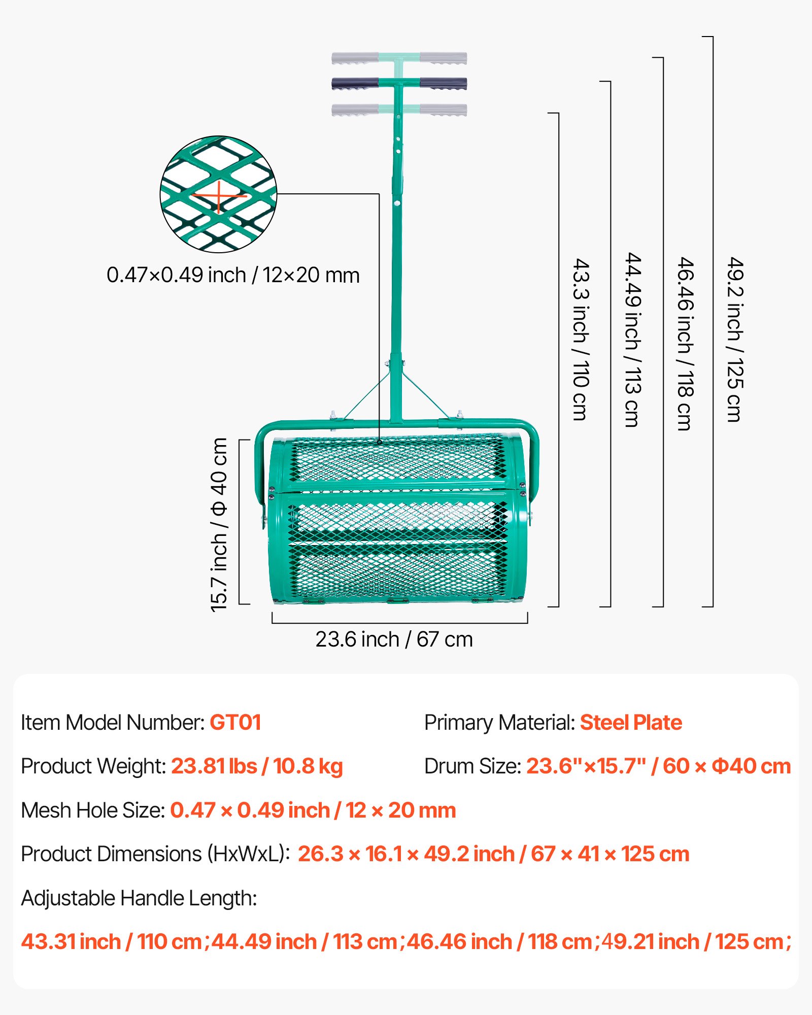 Veličina mreže: 12 × 20 mm / 0,47 × 0,49 in, Težina proizvoda: 23,81 lbs / 10,8 kg, Glavni materijal: Čelična ploča, Veličina bubnja: 60 x 40 cm / 23,6 x 15,7 in, Podesiva duljina ručke: 43,31 in / 110 cm, 44,49 in / 113 cm, 46,46 in / 118 cm, 49,21 in / 125 cm, Broj modela artikla: GT01, Dimenzije proizvoda (V x Š x D): 67 x 41 x 125 cm / 26,3 x 16,1 x 49,2 inča