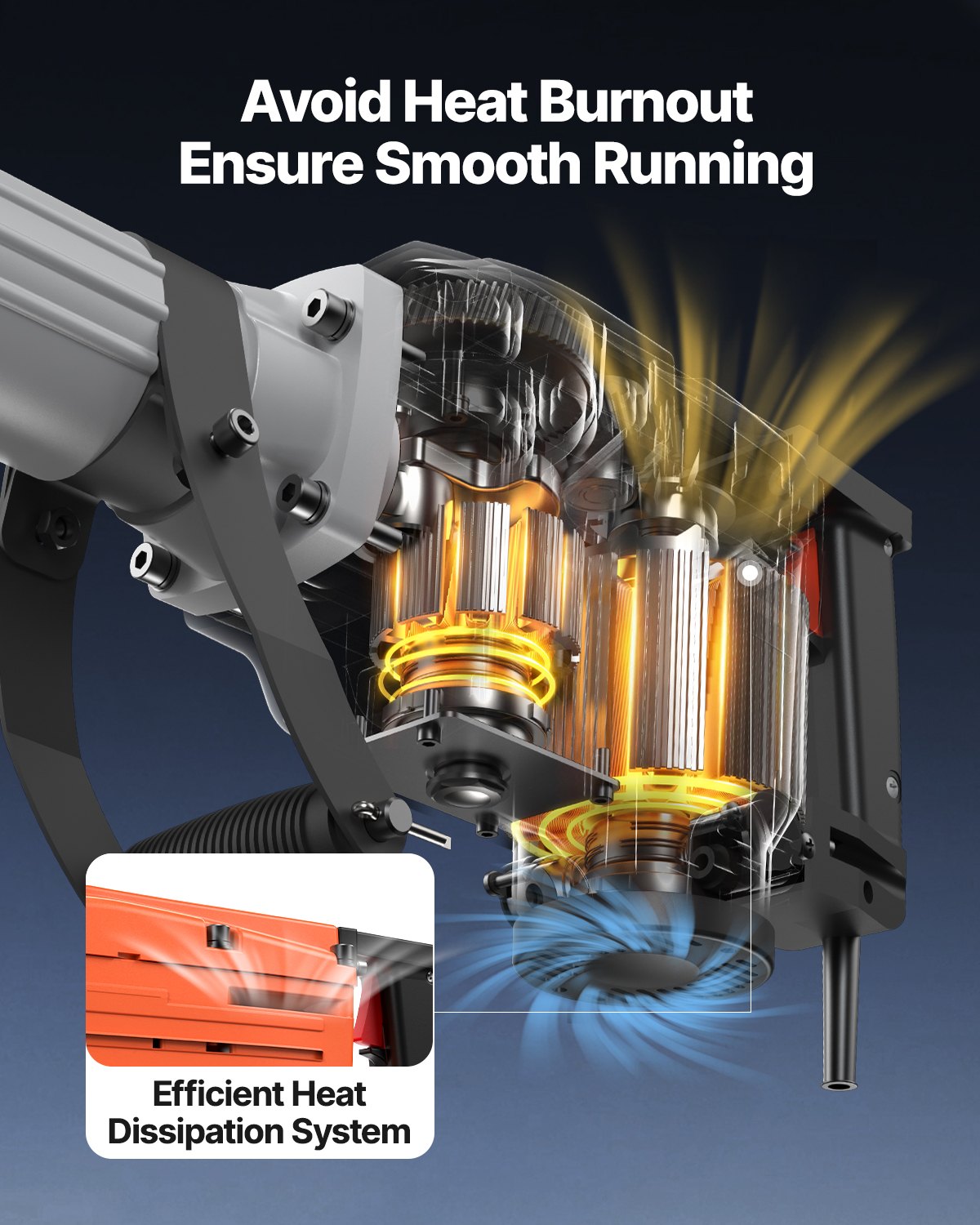 Motor od bakra ima snažnu snagu od 2200 W i isporučuje 1350 udaraca u minuti za bez napora probijanje betona, cigle, tla i zemlje. Visoka nosivost i povećana učinkovitost također znače povećanu produktivnost.
