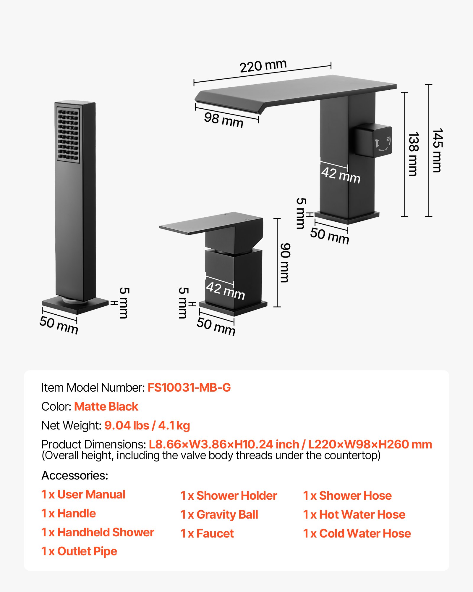 Neto težina: 9,04 lbs / 4,1 kg, Boja: Mat crna, Broj modela artikla: FS10031-MB-G, Dimenzije proizvoda: 8,66 x 7,48 x 3,86 in / 220 x 190 x 98 mm