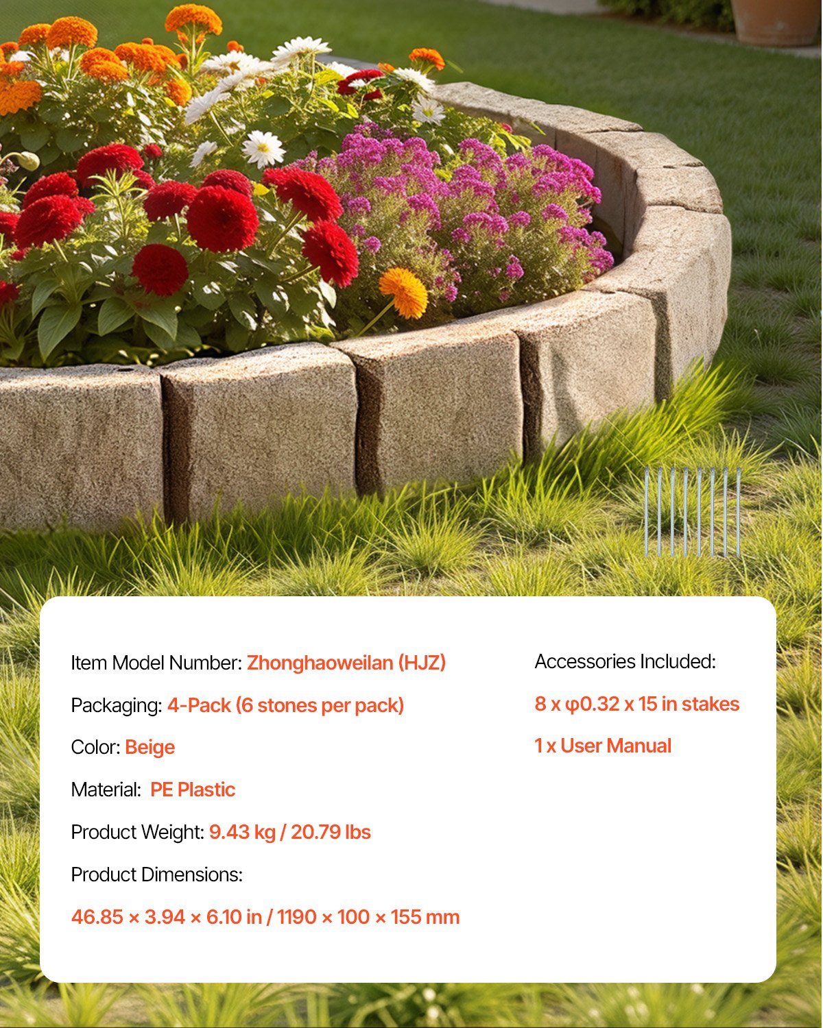 Težina proizvoda: 9,43 kg, Boja: Bež, Broj modela artikla: Zhonghaoweilan (HJZ), Materijal: PE plastika, Dimenzije proizvoda: 46,85 x 3,94 x 6,10 inča / 1190 x 100 x 155 mm, Pakiranje: Pakiranje od 4 (6 kamenčića po pakiranju)