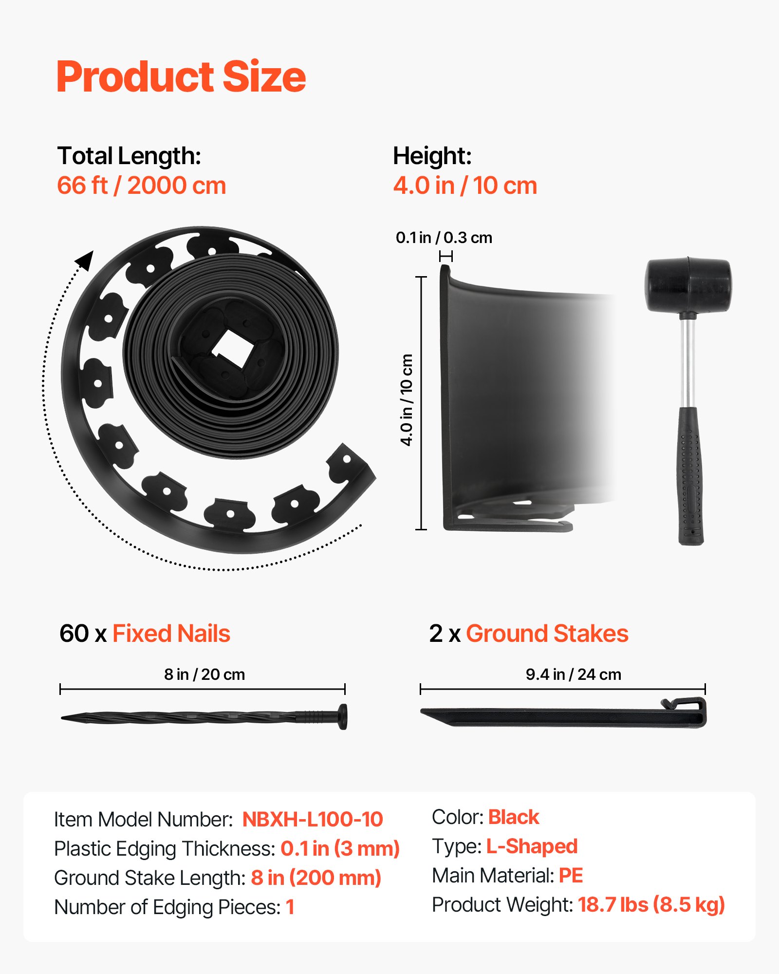 Duljina šiljaka za zemlju: 240 mm, Vrsta: L-oblik, Težina proizvoda: 8,5 kg, Dimenzije plastičnog ruba: 2000 x 10 cm, Duljina šiljaka za zemlju: 200 mm, Broj komada ruba: 1, Glavni materijal: PE, Boja: Crna, Broj modela artikla: NBXH-L100-20, Debljina plastičnog ruba: 3 mm