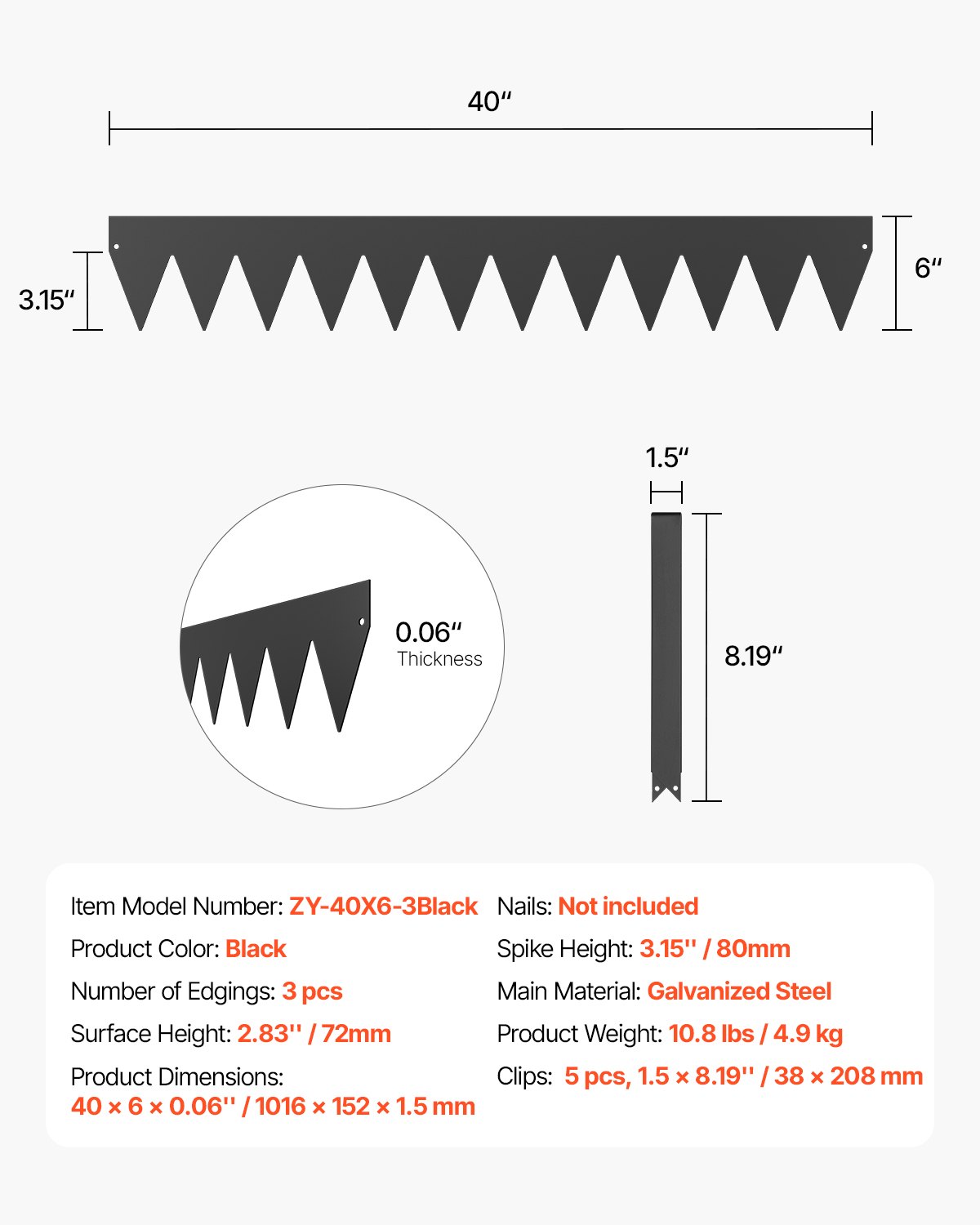 Broj rubova: 3, Boja proizvoda: Crna, Težina proizvoda: 4,9 kg, Čavli: Nisu uključeni, Glavni materijal: Pocinčani čelik, Visina šiljaka: 80 mm, Broj modela artikla: ZY-40X6-3Crna, Visina površine: 72 mm, Kopče: 5 komada, 38 x 208 mm, Dimenzije proizvoda: 1016 x 152 x 1,5 mm
