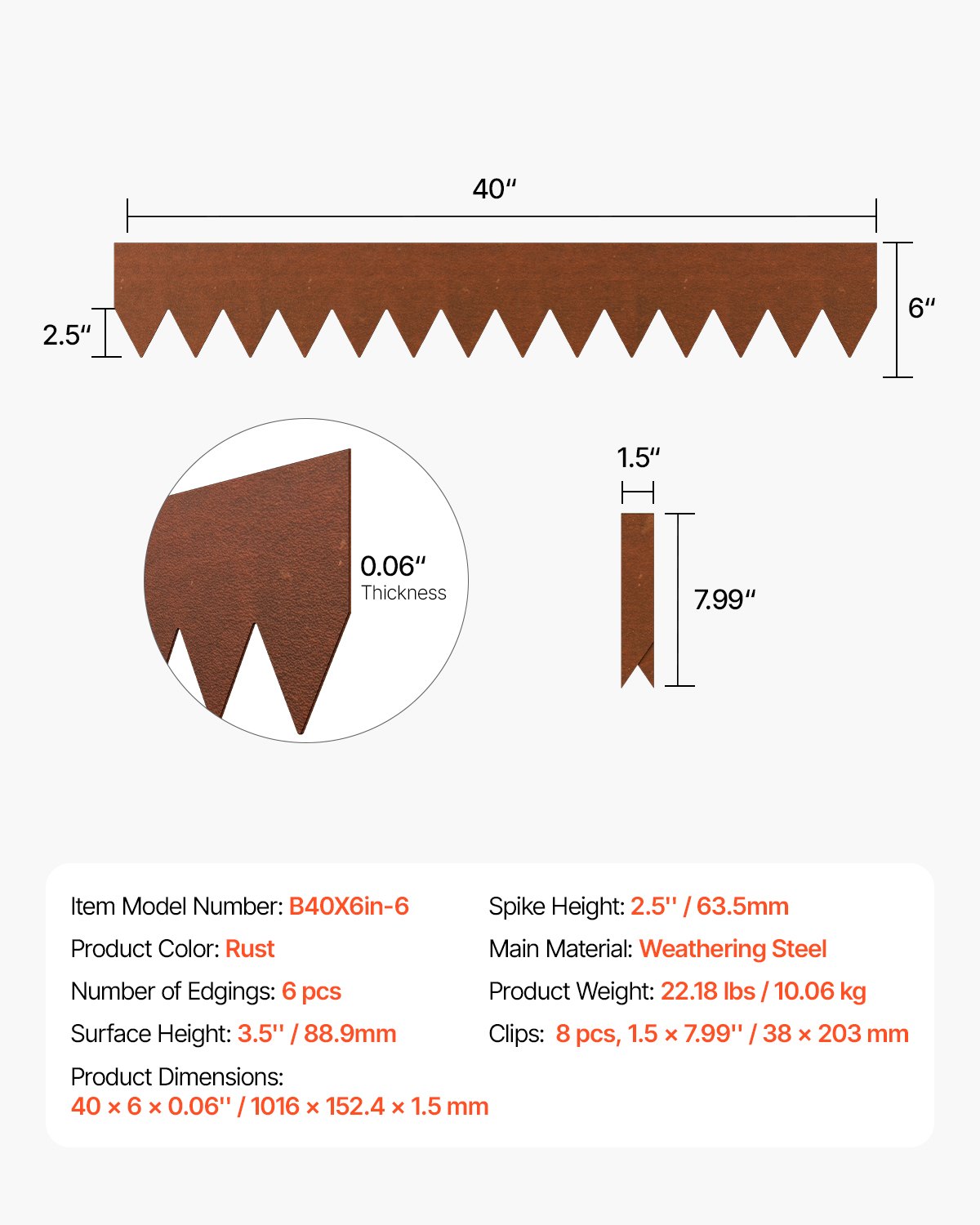 Broj rubova: 6 kom, Boja proizvoda: Hrđa, Težina proizvoda: 22,18 lbs / 10,06 kg, Glavni materijal: Čelik otporan na vremenske uvjete, Visina šiljaka: 2,5” / 63,5 mm, Broj modela artikla: B40X6in-6, Visina površine: 3,5” / 88,9 mm, Kopče: 8 kom, 1,5 x 7,99” / 38 x 203 mm, Dimenzije proizvoda: 40 x 6 x 0,06 inča / 1016 x 152,4 x 1,5 mm