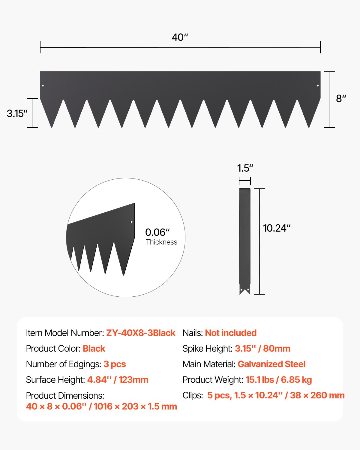 Broj rubova: 3 kom, Boja proizvoda: Crna, Težina proizvoda: 15,1 lbs / 6,85 kg, Čavli: Nisu uključeni, Glavni materijal: Pocinčani čelik, Visina šiljaka: 3,15 in / 80 mm, Broj modela artikla: ZY-40X8-3Crna, Visina površine: 4,84 in / 123 mm, Kopče: 5 kom, 1,5 x 10,24 in / 38 x 260 mm, Dimenzije proizvoda: 40 x 8 x 0,06 inča / 1016 x 203 x 1,5 mm