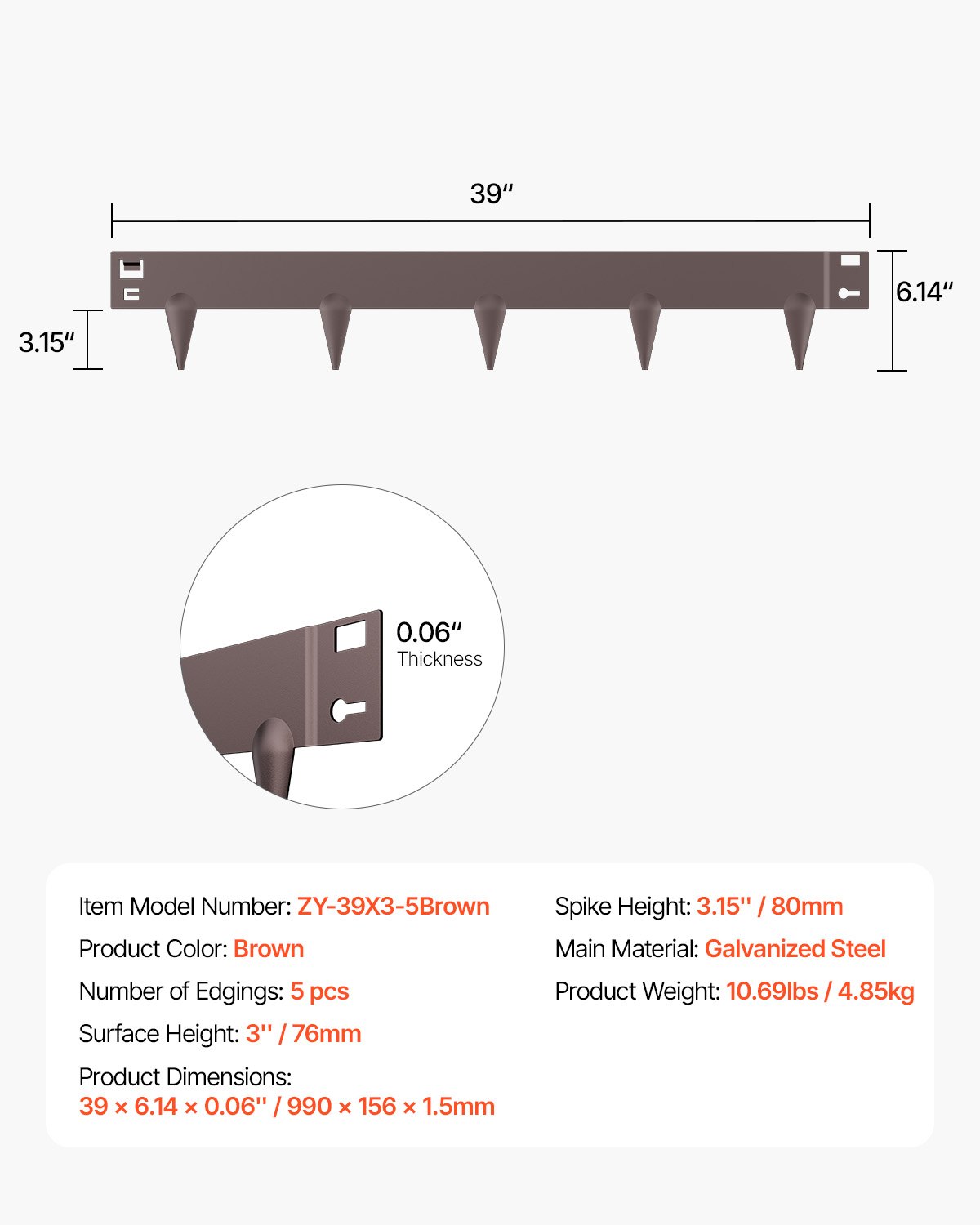 Broj rubova: 5, Boja proizvoda: Smeđa, Težina proizvoda: 11,79 lbs / 5,35 kg, Glavni materijal: Pocinčani čelik, Visina šiljaka: 3,15 in / 80 mm, Broj modela artikla: ZY-39X3-5Smeđa, Visina površine: 3 in / 76 mm, Dimenzije proizvoda: 39 x 6,14 x 0,06 in / 990 x 156 x 1,5 mm