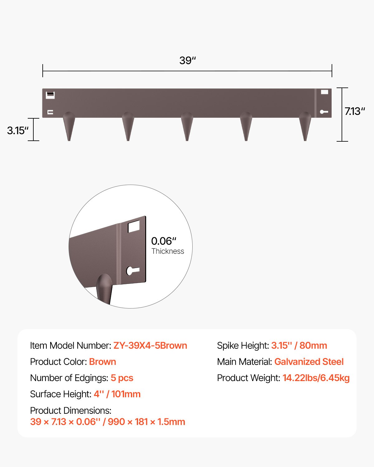 Broj rubova: 5, Boja proizvoda: Smeđa, Težina proizvoda: 14,22 lbs / 6,45 kg, Glavni materijal: Pocinčani čelik, Visina šiljaka: 3,15 in / 80 mm, Broj modela artikla: ZY-39X4-5Smeđa, Visina površine: 4 in / 101 mm, Dimenzije proizvoda: 39 x 7,13 x 0,06 in / 990 x 181 x 1,5 mm