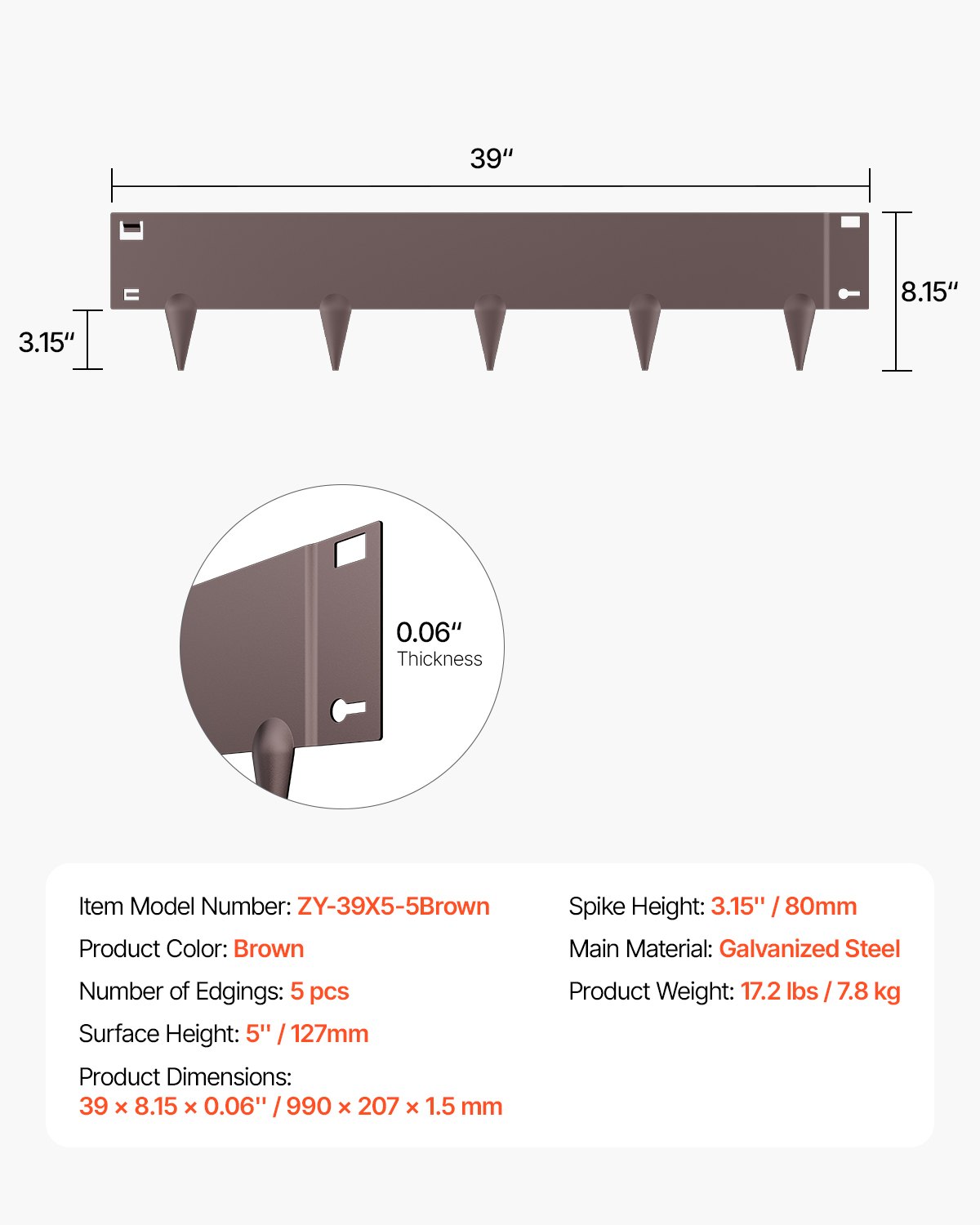 Broj rubova: 5, Boja proizvoda: Smeđa, Težina proizvoda: 7,8 kg, Glavni materijal: Pocinčani čelik, Visina šiljaka: 80 mm, Broj modela artikla: ZY-39X5-5Smeđa, Visina površine: 127 mm, Dimenzije proizvoda: 990 x 207 x 1,5 mm