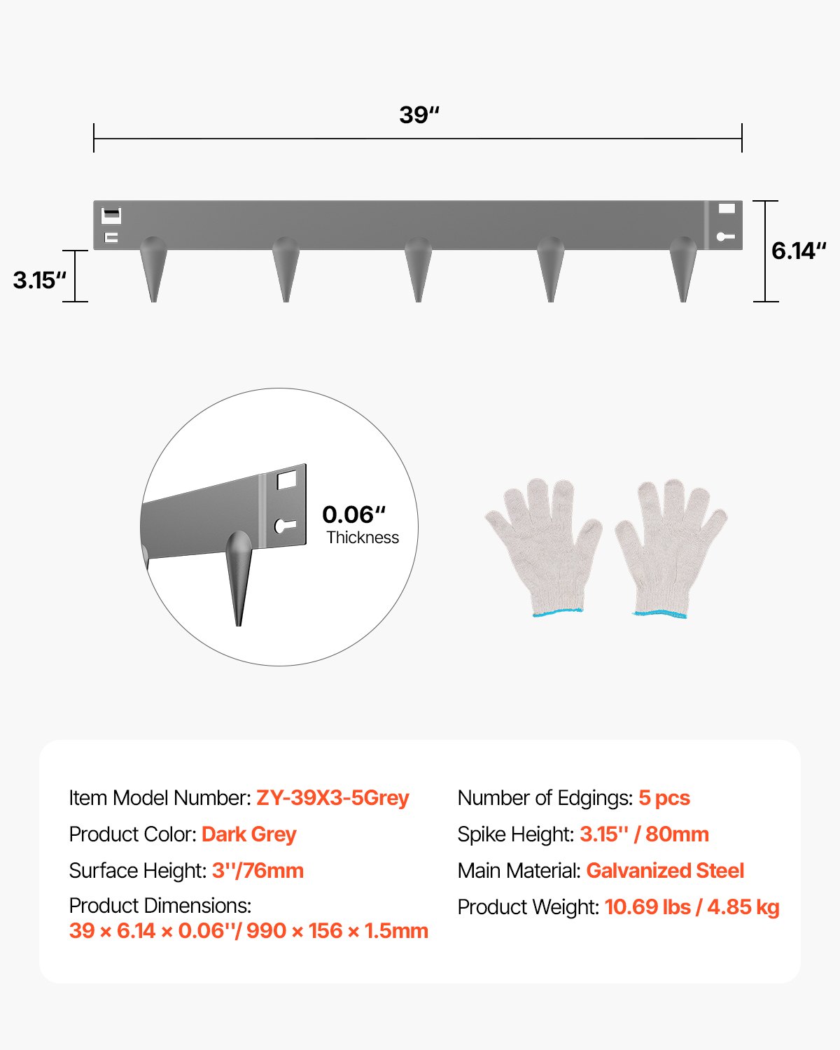 Broj rubova: 5 komada, Boja proizvoda: Tamno siva, Težina proizvoda: 10,69 lbs / 4,85 kg, Glavni materijal: Pocinčani čelik, Visina šiljaka: 3,15 in / 80 mm, Broj modela artikla: ZY-39X3-5Siva, Visina površine: 3 in / 76 mm, Dimenzije proizvoda: 39 x 6,14 x 0,06 in / 990 x 156 x 1,5 mm