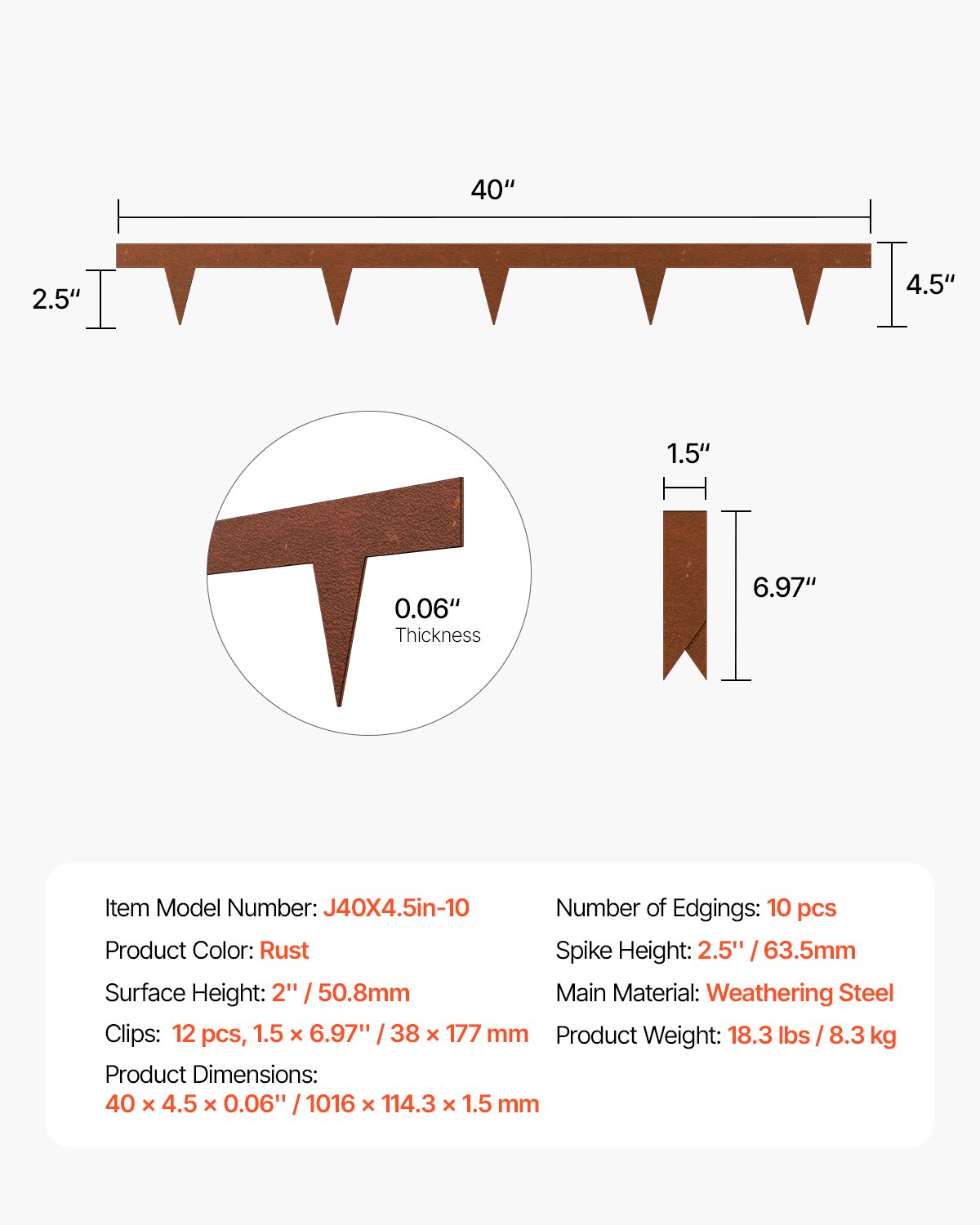 Broj rubova: 10 kom, Boja proizvoda: Hrđa, Težina proizvoda: 18,3 lbs / 8,3 kg, Glavni materijal: Čelik otporan na vremenske uvjete, Visina šiljaka: 2,5” / 63,5 mm, Broj modela artikla: J40X4,5in-10, Visina površine: 2” / 50,8 mm, Kopče: 12 kom, 1,5 x 6,97” / 38 x 177 mm, Dimenzije proizvoda: 40 x 4,5 x 0,06 inča / 1016 x 114,3 x 1,5 mm