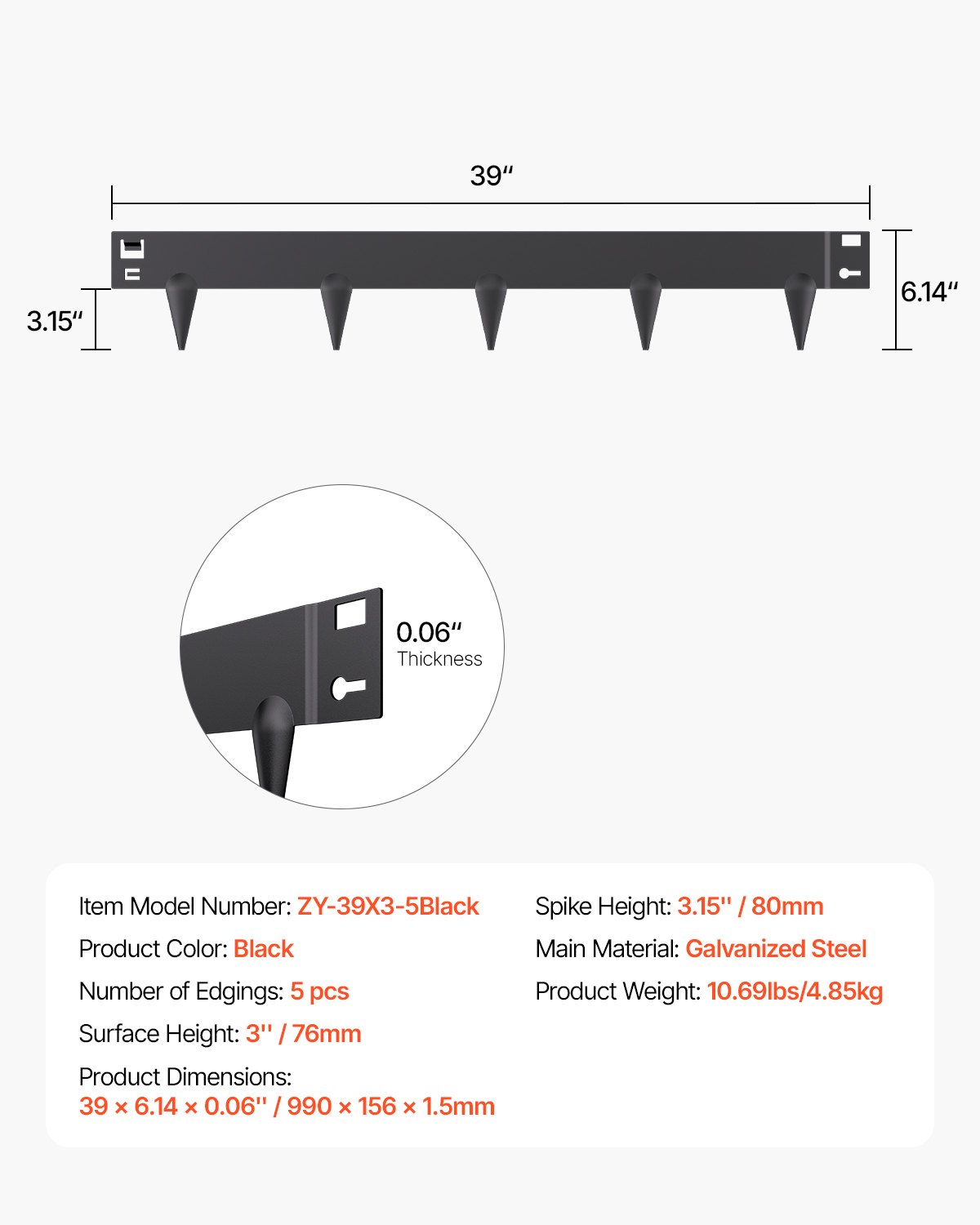 Broj rubova: 5 kom, Boja proizvoda: Crna, Težina proizvoda: 11,79 lbs / 5,35 kg, Glavni materijal: Pocinčani čelik, Visina šiljaka: 3,15 in / 80 mm, Broj modela artikla: ZY-39X3-5Crna, Visina površine: 3 in / 76 mm, Dimenzije proizvoda: 39 x 6,14 x 0,06 in / 990 x 156 x 1,5 mm